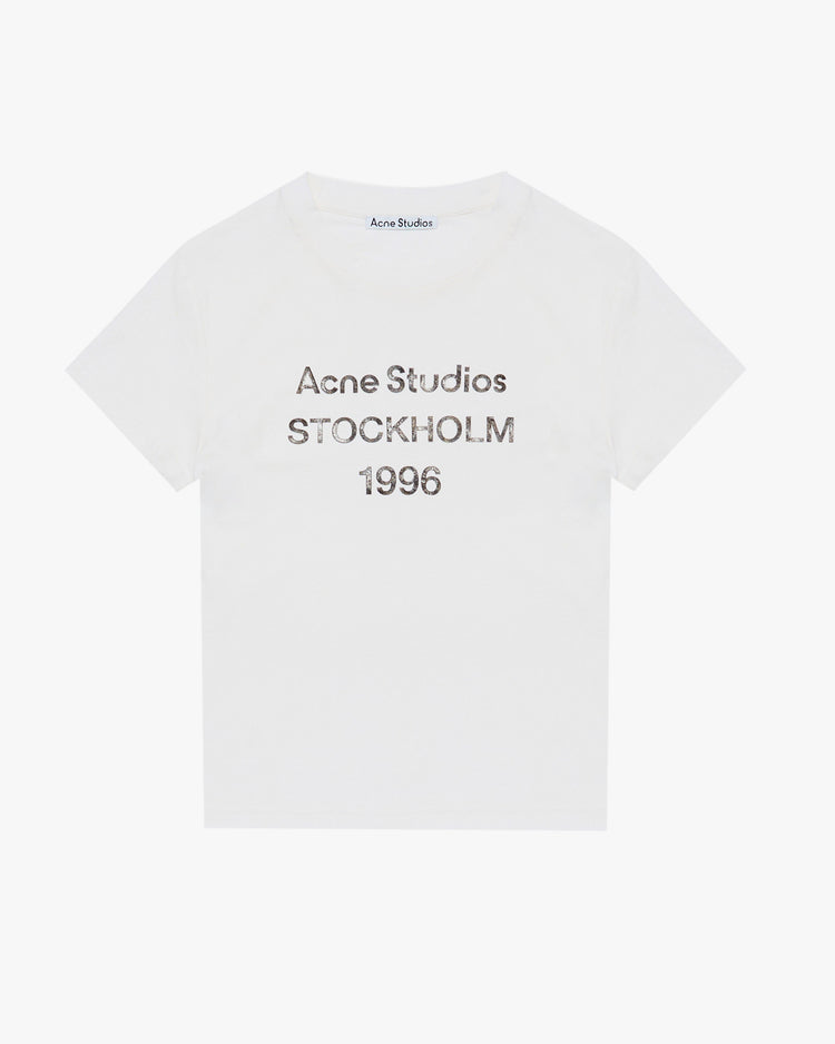Slim fit tee, cut from an organic cotton jersey. A 'baby-tee' silhouette, featuring a crew neckline, distressed details on neck, arm and hem, cropped length and a large Acne Studios 1996 logo at the front.