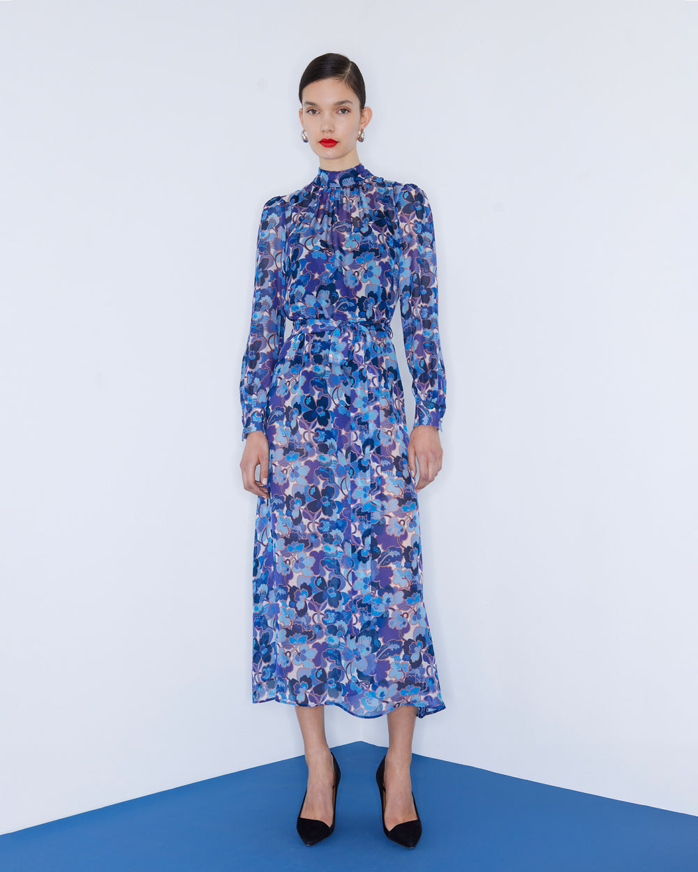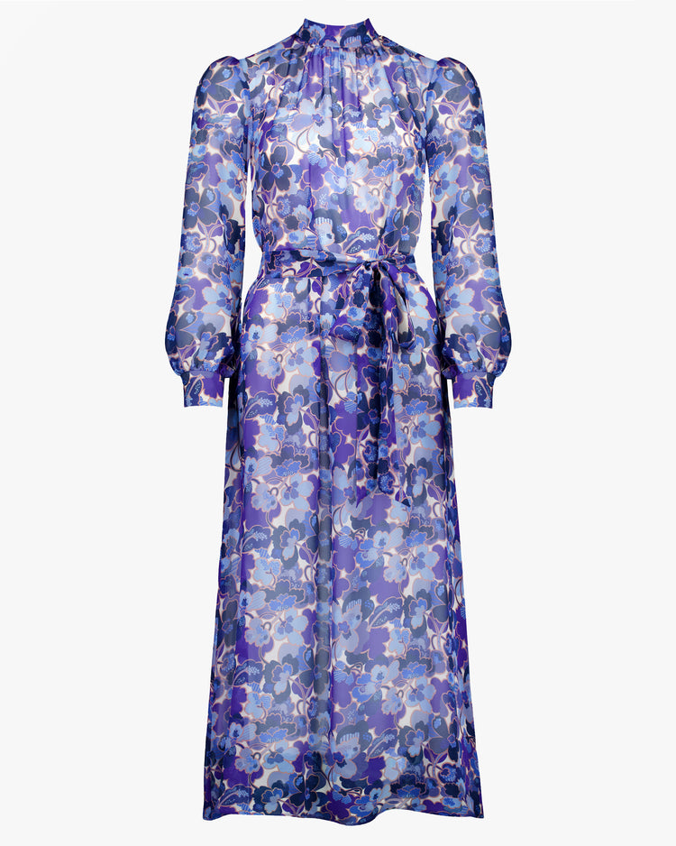 Relaxed fit dress, cut from a floral printed silk chiffon. Featuring a high band collar, delicate gathers at neckline, long voluminous sleeves, wide buttoned cuffs and removeable self tie at waist. Semi sheer, best paired with the Helen Cherry Nude Underslip.
