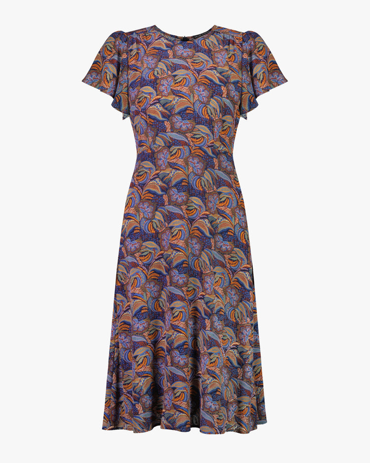 Classic fit dress, cut from a printed silk crepe de chine. Featuring flared short sleeves with gathered sleeve head and tailored through the waist.