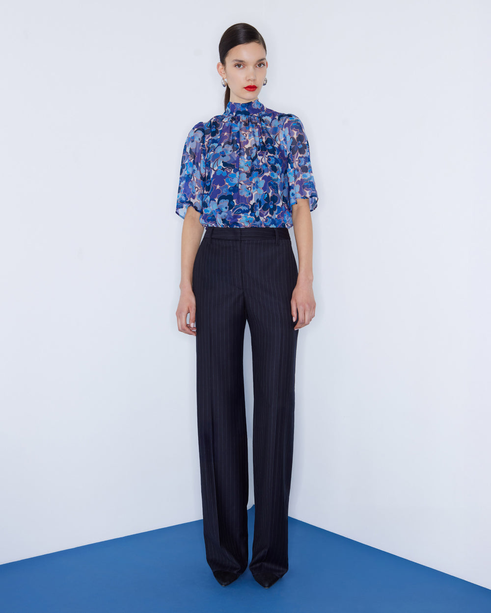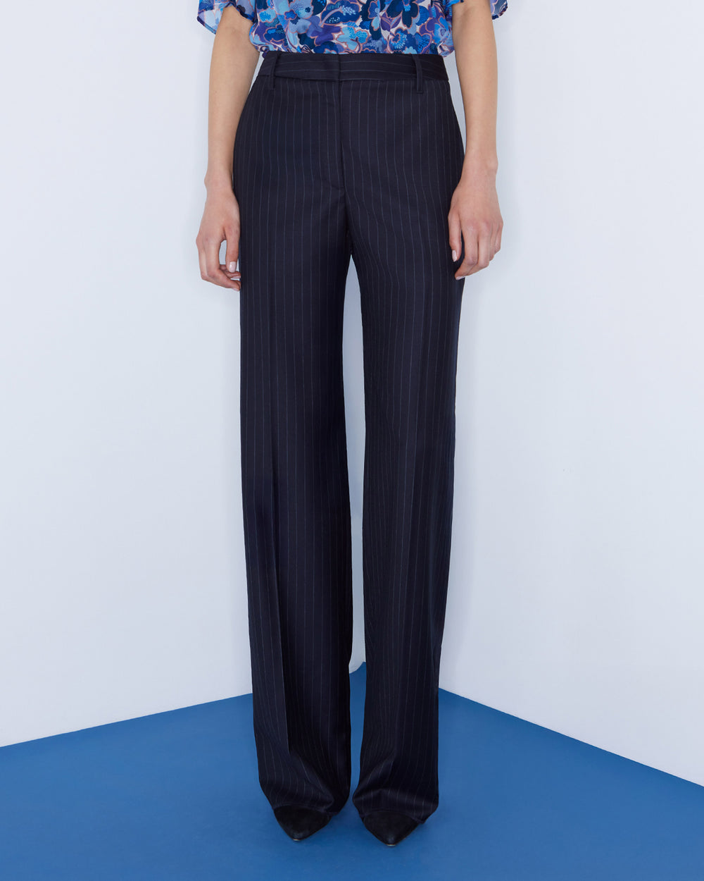High waisted trouser, cut from a navy wool pinstripe suiting. Featuring a wide-straight leg silhouette, tailored waistband and pressed creases. Pair with the matching Helen Cherry Rae Pinstripe Blazer.