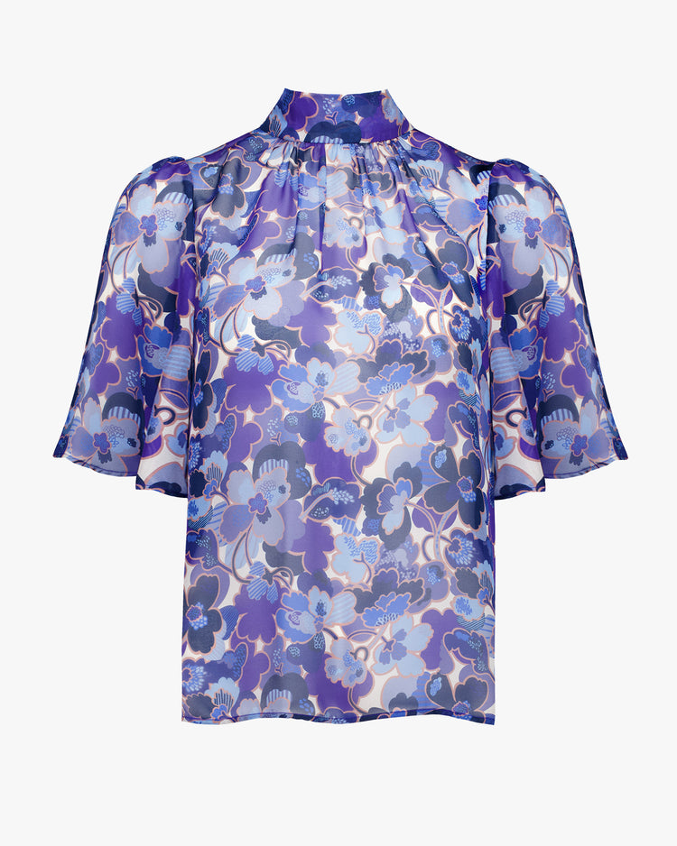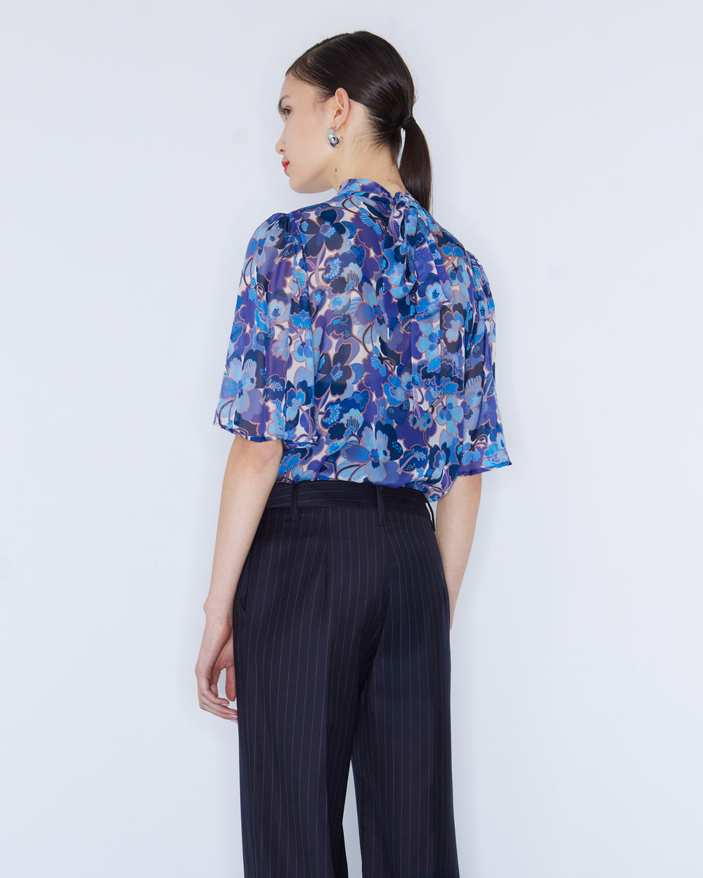 Relaxed fit blouse, cut from a floral printed silk chiffon. Featuring a high band collar that ties at back and elbow length flare sleeves. Style with your favourite pair of Helen Cherry trousers.