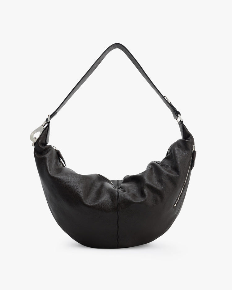- Zipped side pocket with metal slider and leather pull tabs