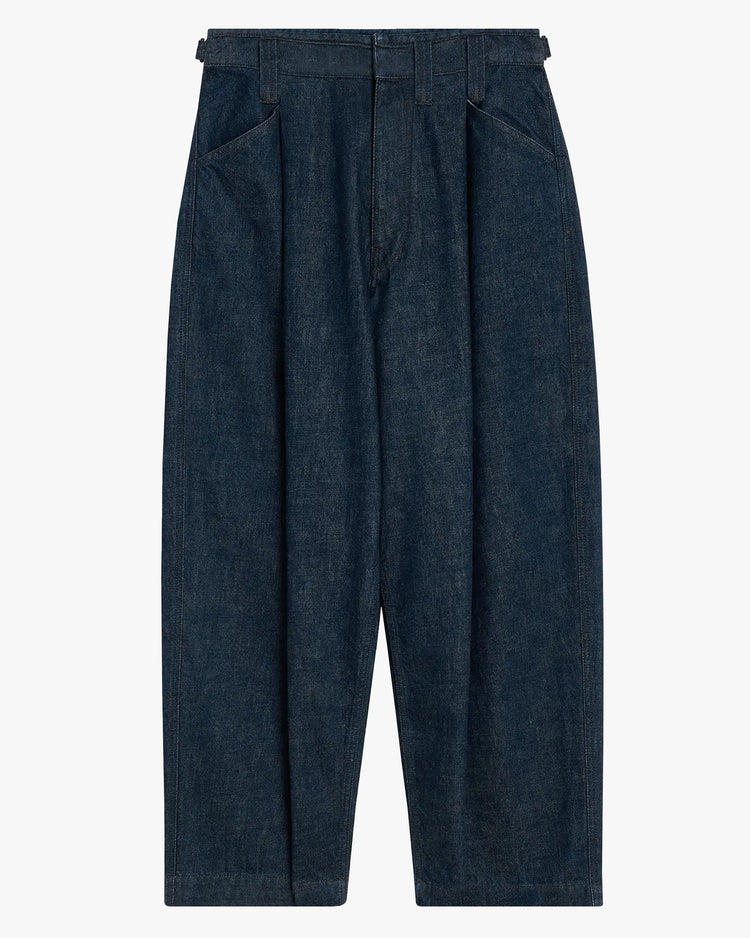 Pleated Workwear Pants, crafted from heavy denim with a deep indigo wash, feature curved side seams for subtle volume, a relaxed tapered leg, and classic workwear details like diagonal pockets, generous belt loops, a back yoke, and patch pockets.