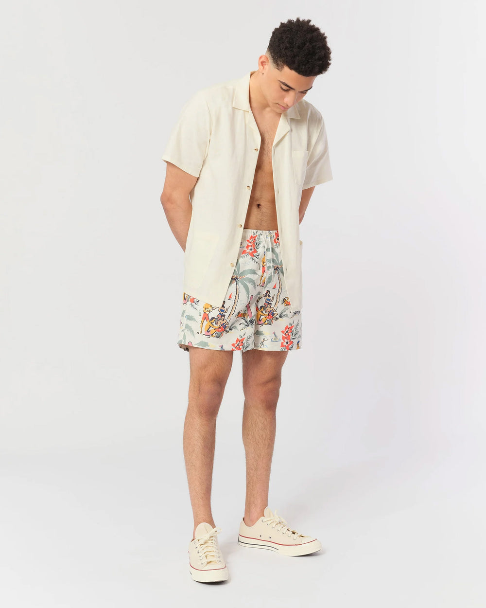 Relaxed fit swim short, cut from a tie-dyed recycled quick-dry polyester. The Trippin' beach short is a nod to retro Polyneasian motifs. Featuring an elasticated waistband with drawstring, patch pocket at back with snap closure and comfortable ultra fine mesh lining. Perfect for the poolside or styling with a light-weight cotton button up for an effortless summer look.