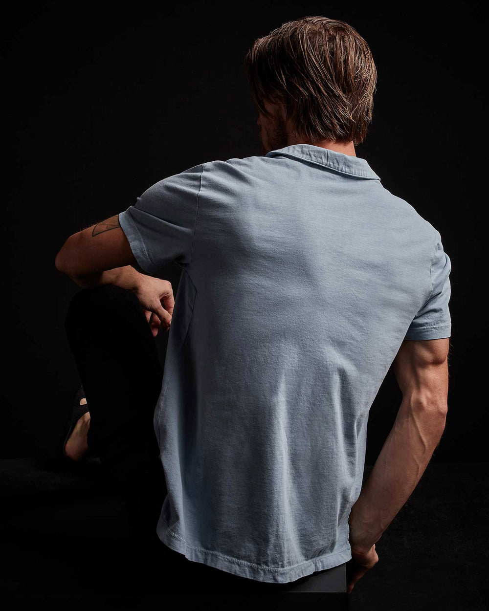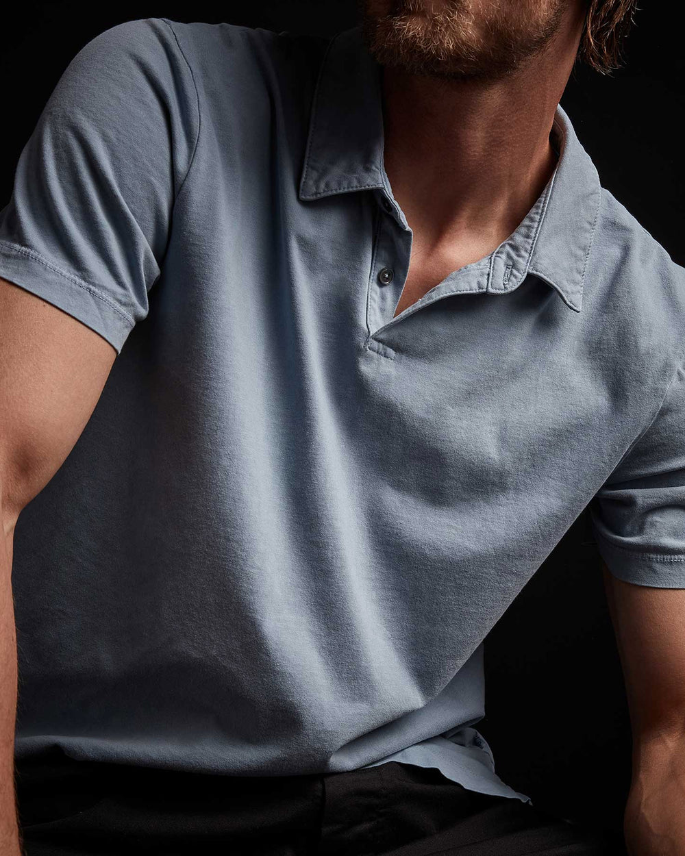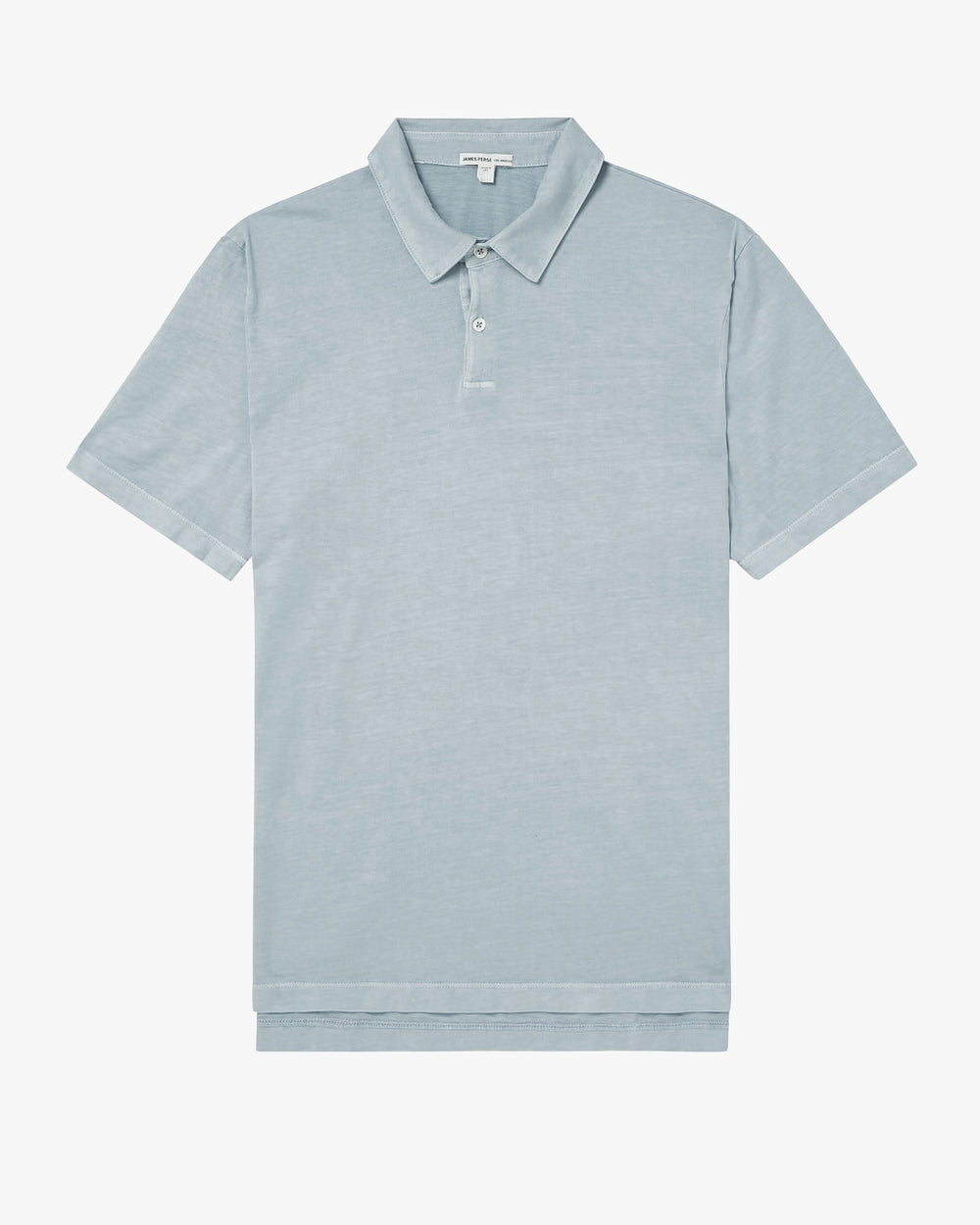 A core James Perse style. Classic fit polo, cut from a 100% cotton jersey, brushed to give a lightweight sueded feel. Featuring a polo collar, placket with single button, side slits, a step bottom hem and all over cover lock stitch detail. Garment dyed with extra softeners for a soft and lived in feel.