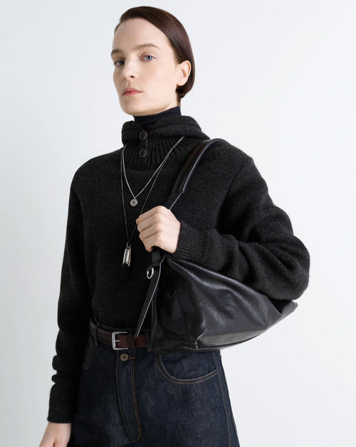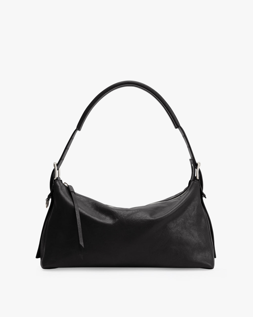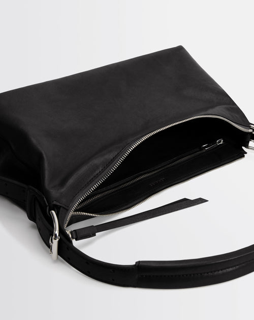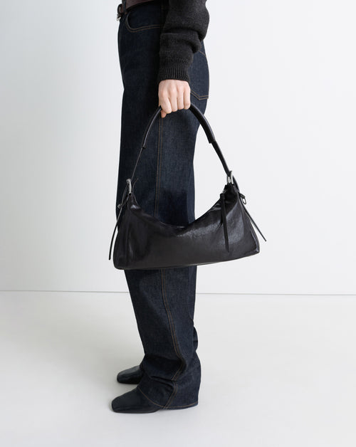 The belted line interprets archetypal shapes in a minimalist, utilitarian spirit. It plays on contrasts thanks to a vegetable tanned leather strap inspired by the belt and shiny elements. Designed to carry everyday essentials, this baguette bag is both practical and stylish, crafted in LWG gold-certified glazed paper leather with a shiny appearance.