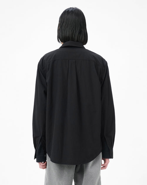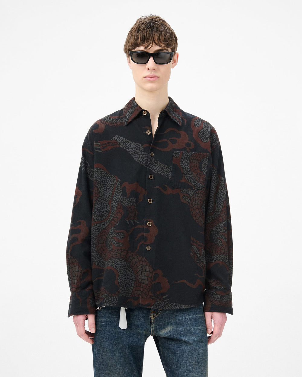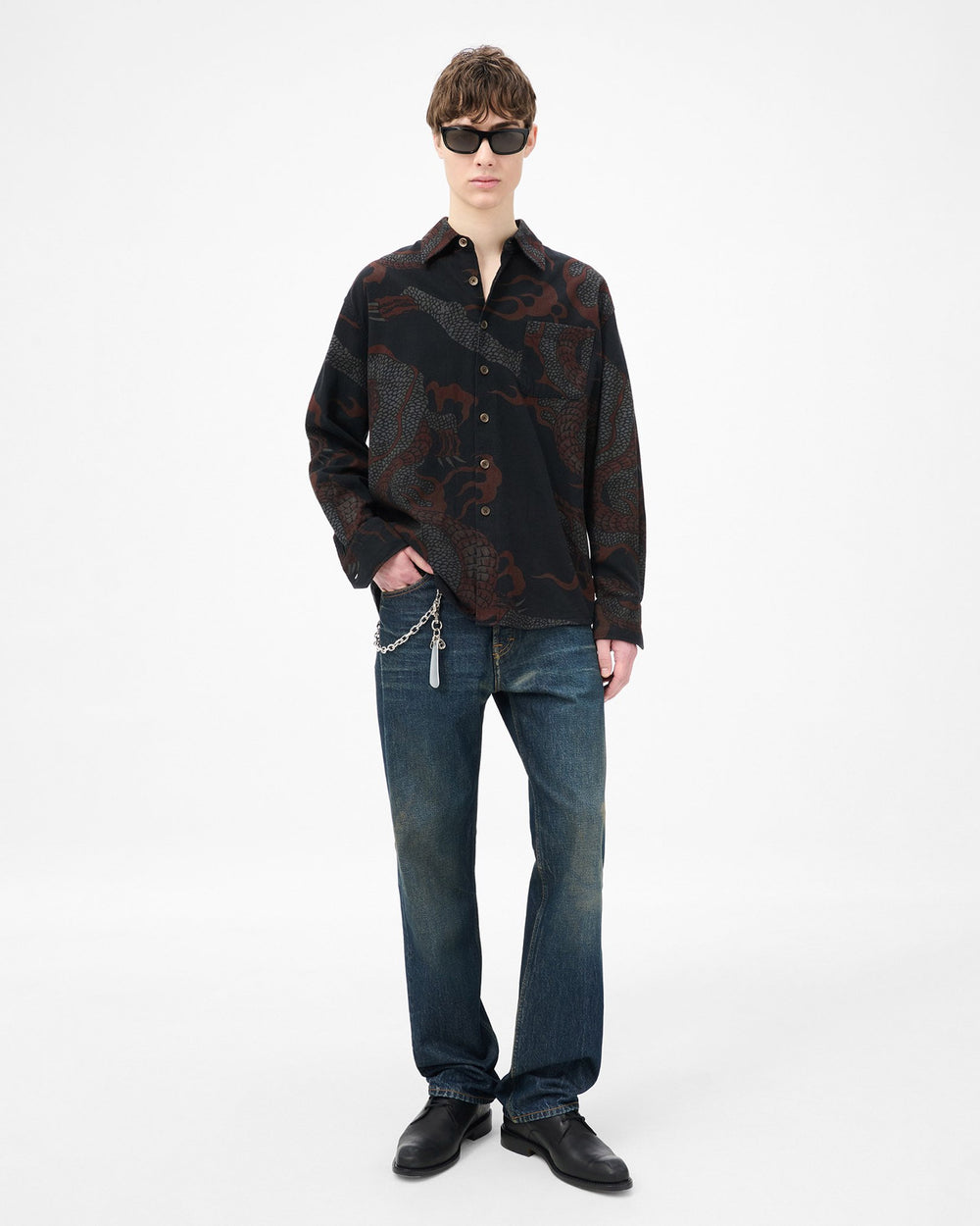 Oversized fit shirt, cut from a Portuguese organic cotton with an abstract snake print. A wide silhouette, featuring a two piece collar, patch pocket at chest, buttoned mitered shirt cuffs and finished with mother of pearl buttons.