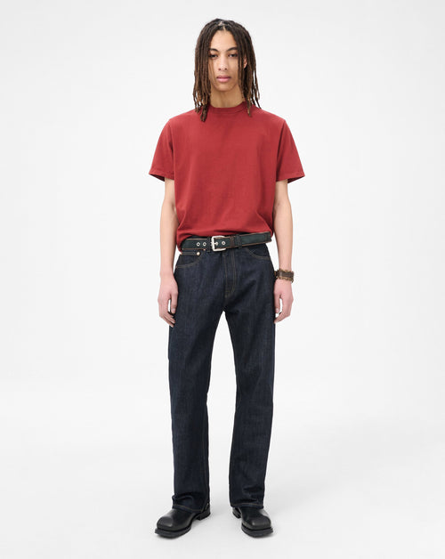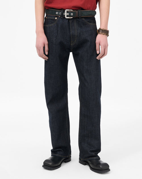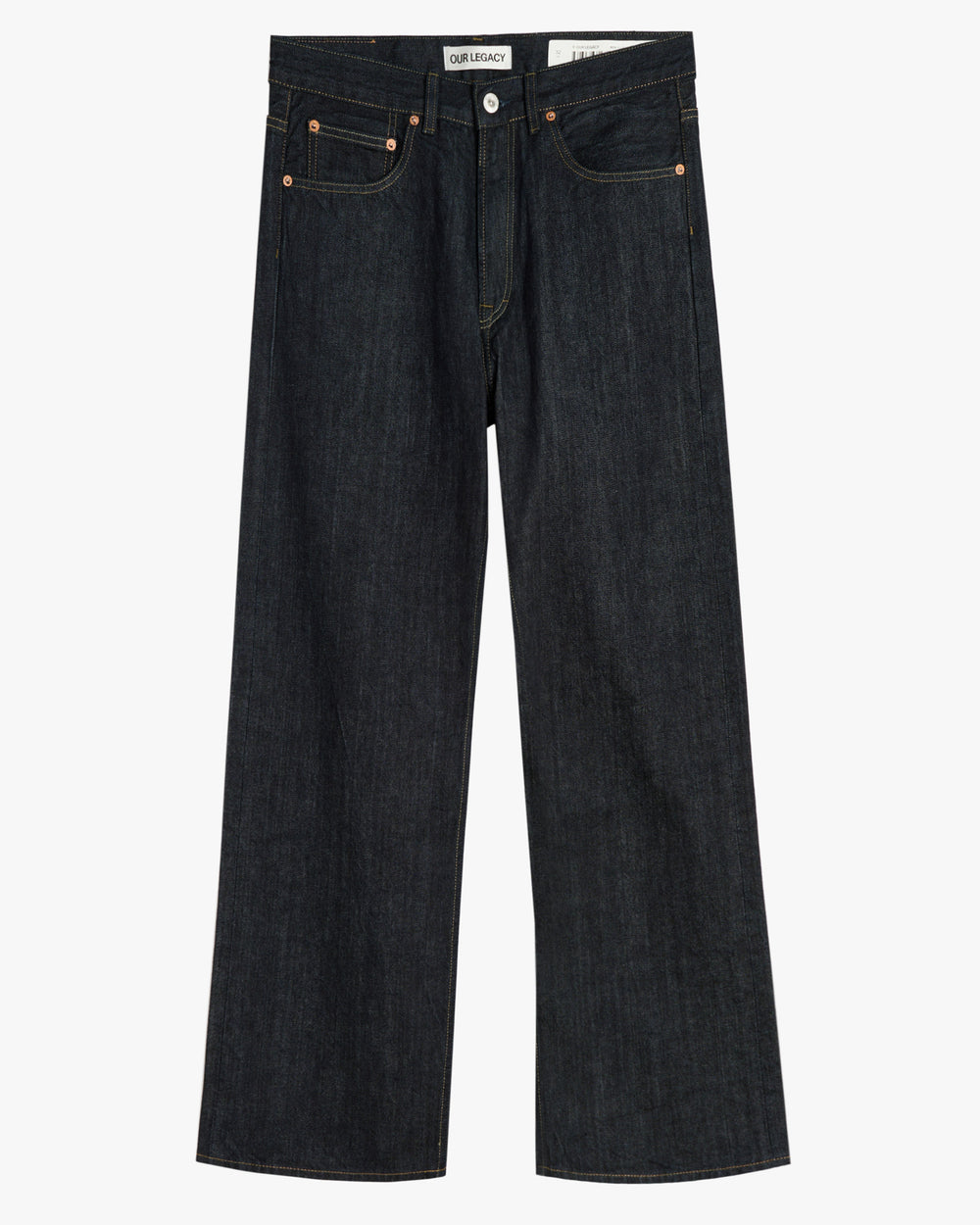 Relaxed fit jeans, cut from an indigo dyed Italian selvedge denim. Featuring a wide-straight leg, belt loops, YKK zip fly, classic five pocket detailing an an Embossed Our Legacy leather logo patch at back waistband.