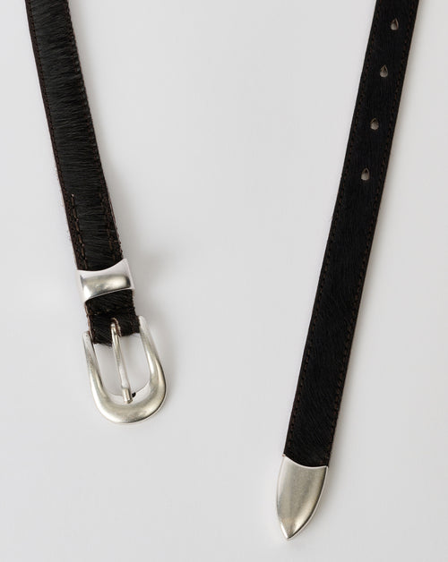 Our Legacy's 2cm belt in Chocolate Hair On Hide. crafted from Italian hair on hide leather. Featuring a metal pin buckle closure, metal tip and a single keeper. Belt features natural imperfections bringing a unique character to each product, expressing an original and authentic look.