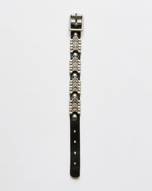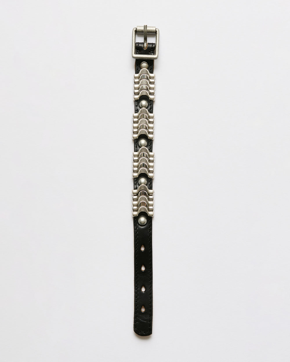 Chunky bracelet, crafted from American Chromexcel leather. Featuring an adjustable wrist strap with interlocking metal wave ornaments, metal pin buckle closure, and rivet details.