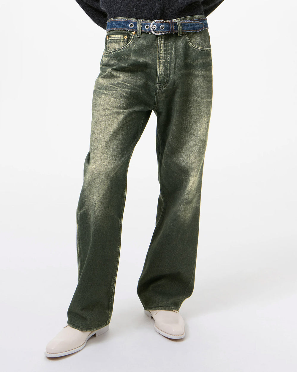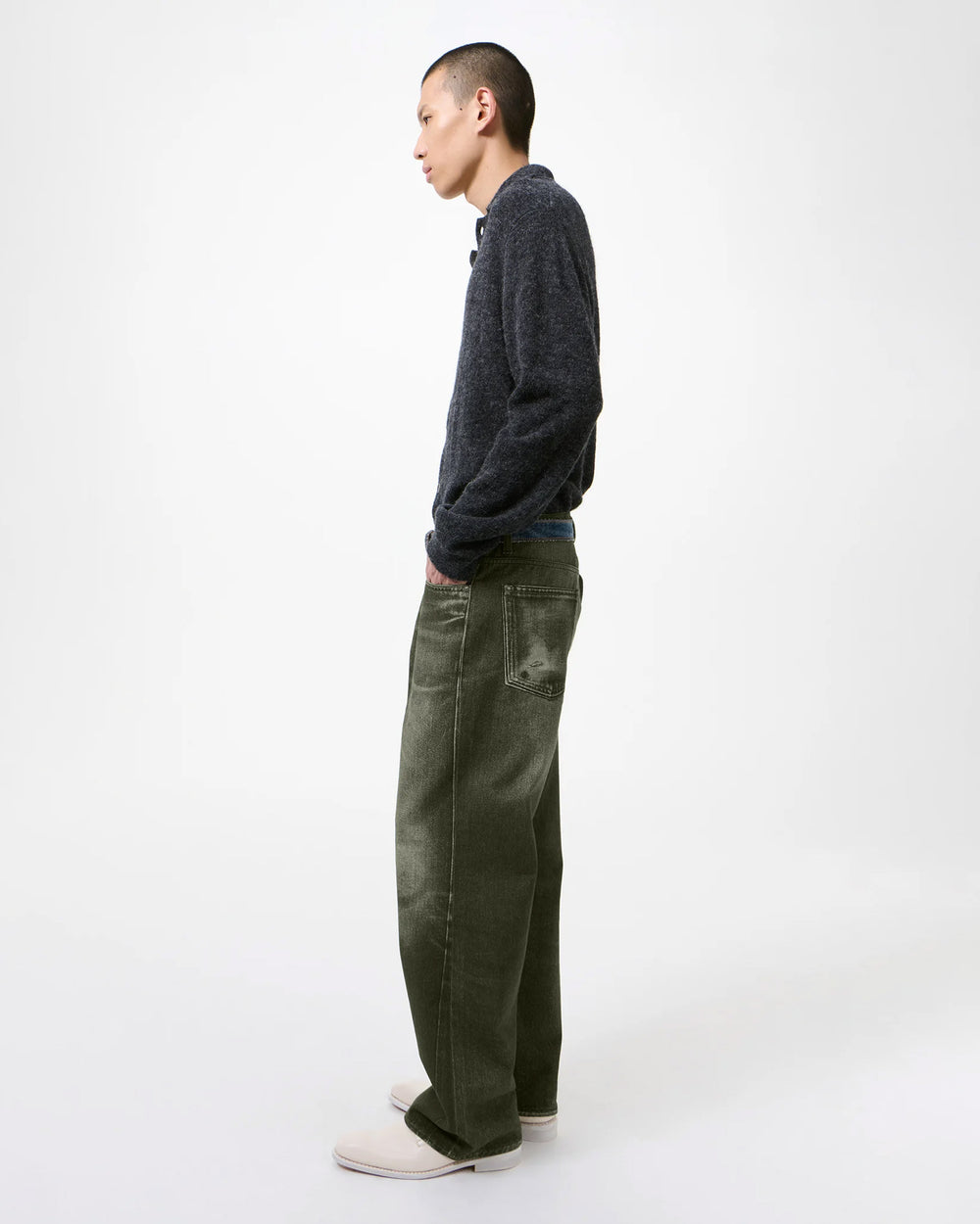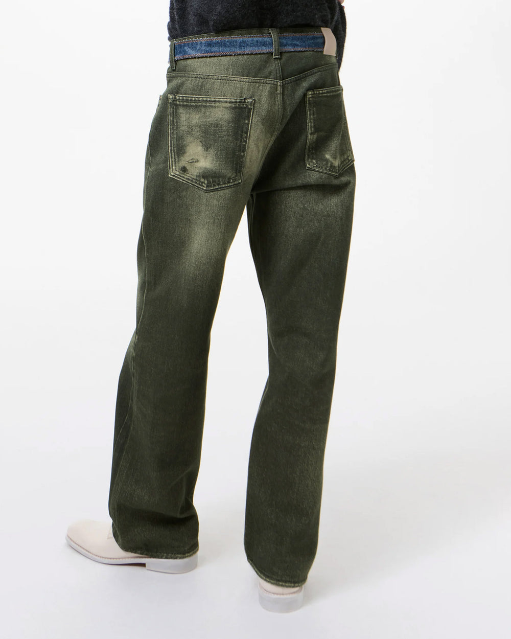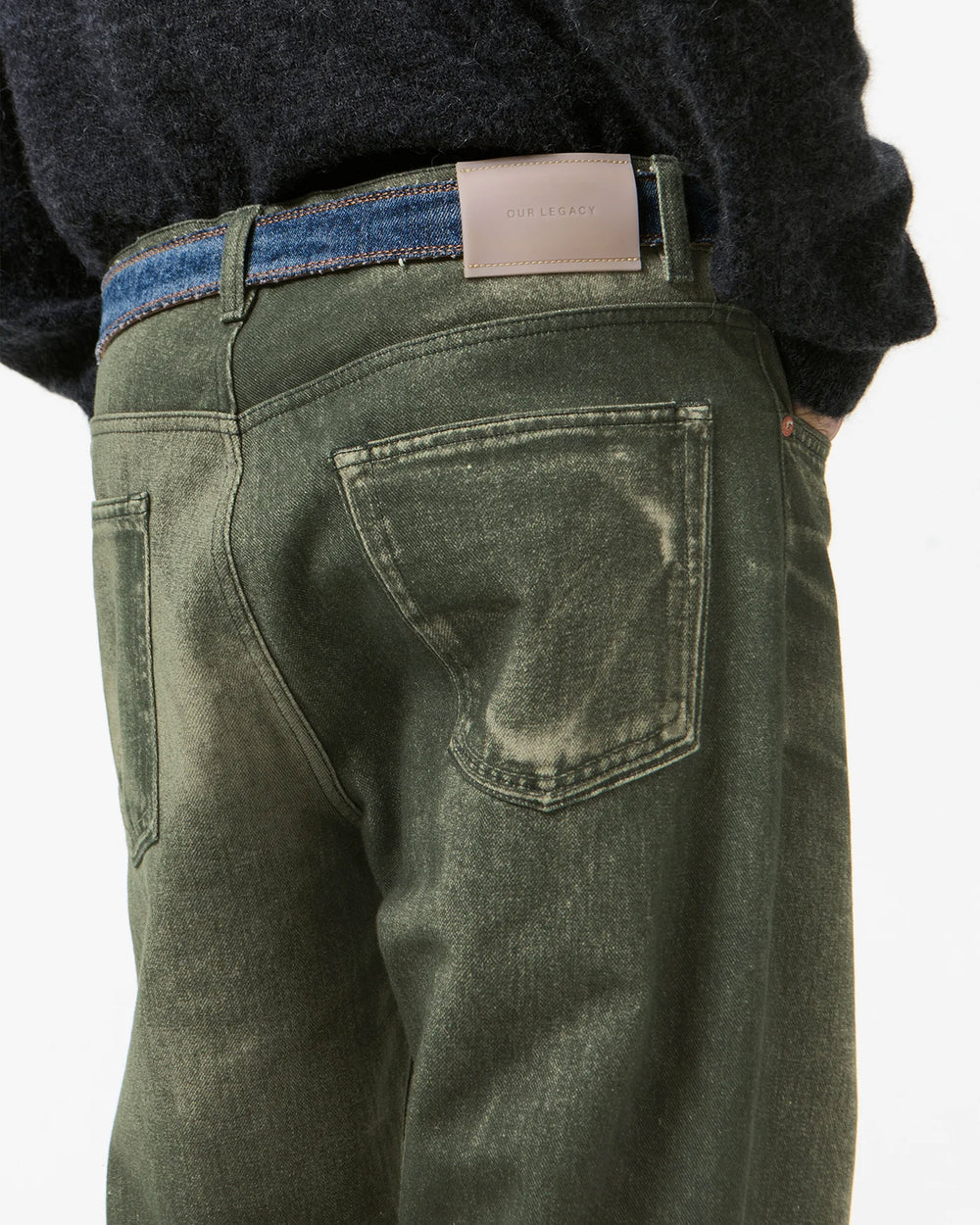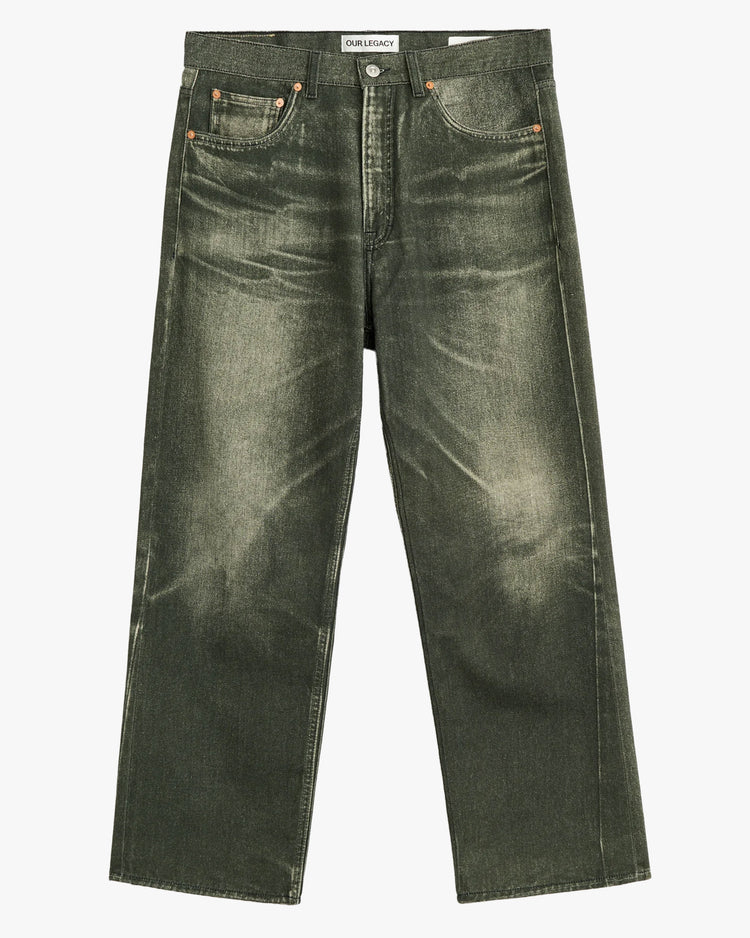 The Our Legacy Third Cut in Digital Black Aurora Print cut from Italian cotton fabric with trompe l'oeil denim print. Featuring a relaxed, wide straight legs, YKK zip fly, metal rivets, five pockets with reinforced back pockets, and the Our Legacy rubber patch. Manufactured from carefully sourced denim fabric. The unique digital print draws inspiration from a collection of vintage denim designs, that has been photographed and digitally manipulated as an interpretation of vintage denim.