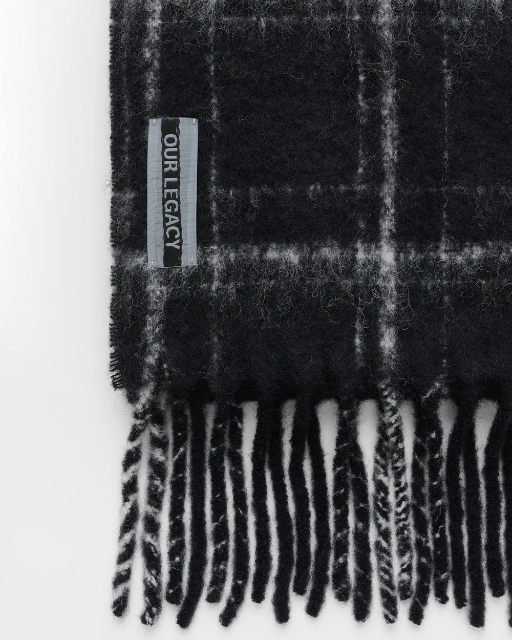 Blanket scarf made from an Italian hairy heavyweight alpaca, wool and polyamide blend fabric in black fuzzy check. Featuring twisted fridges and an Our Legacy stitched woven label.