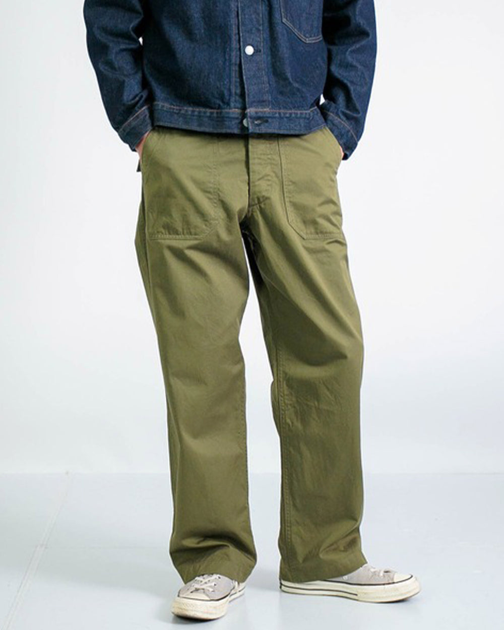 Relaxed fit trouser, cut from a richly textured Japanese compact cotton yarn. A wide leg silhouette that tapers slightly towards the hem, featuring topstitched patch pockets, a zip fly and back flap pockets. Drawing heavily from vintage military styles to create a comfortable yet stylish trouser that can be worn year round.