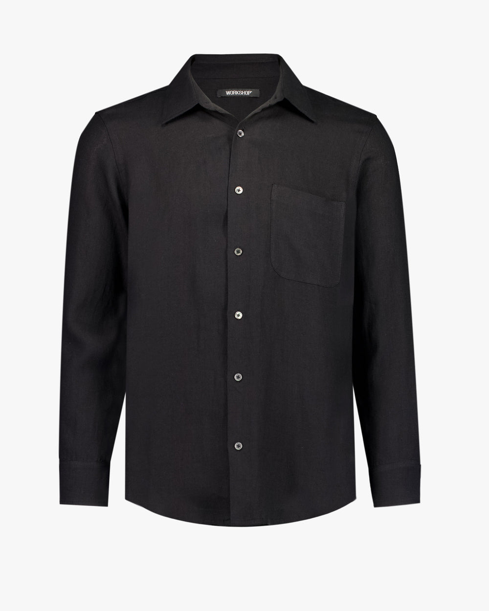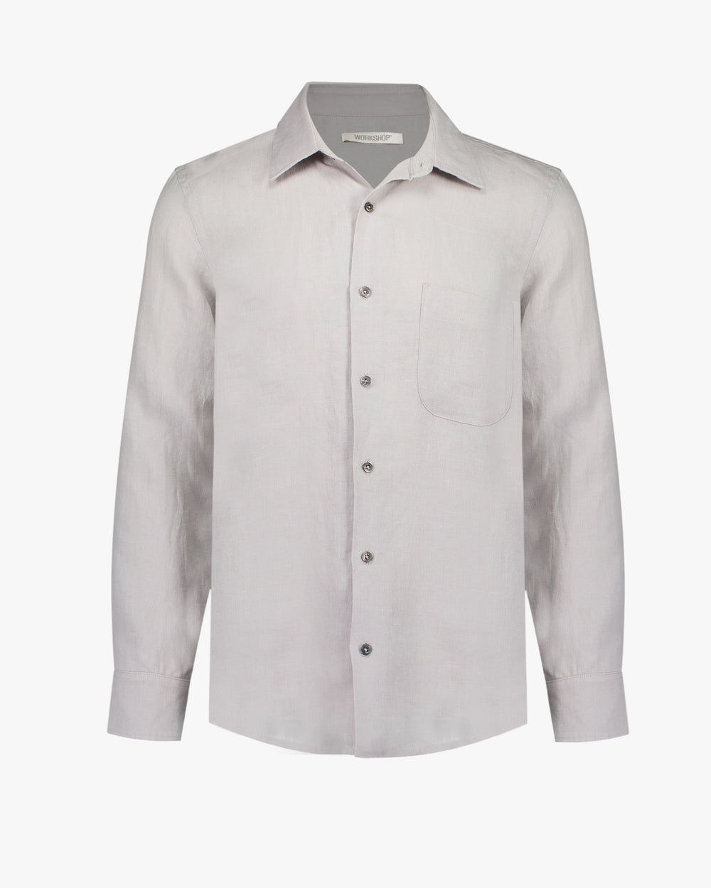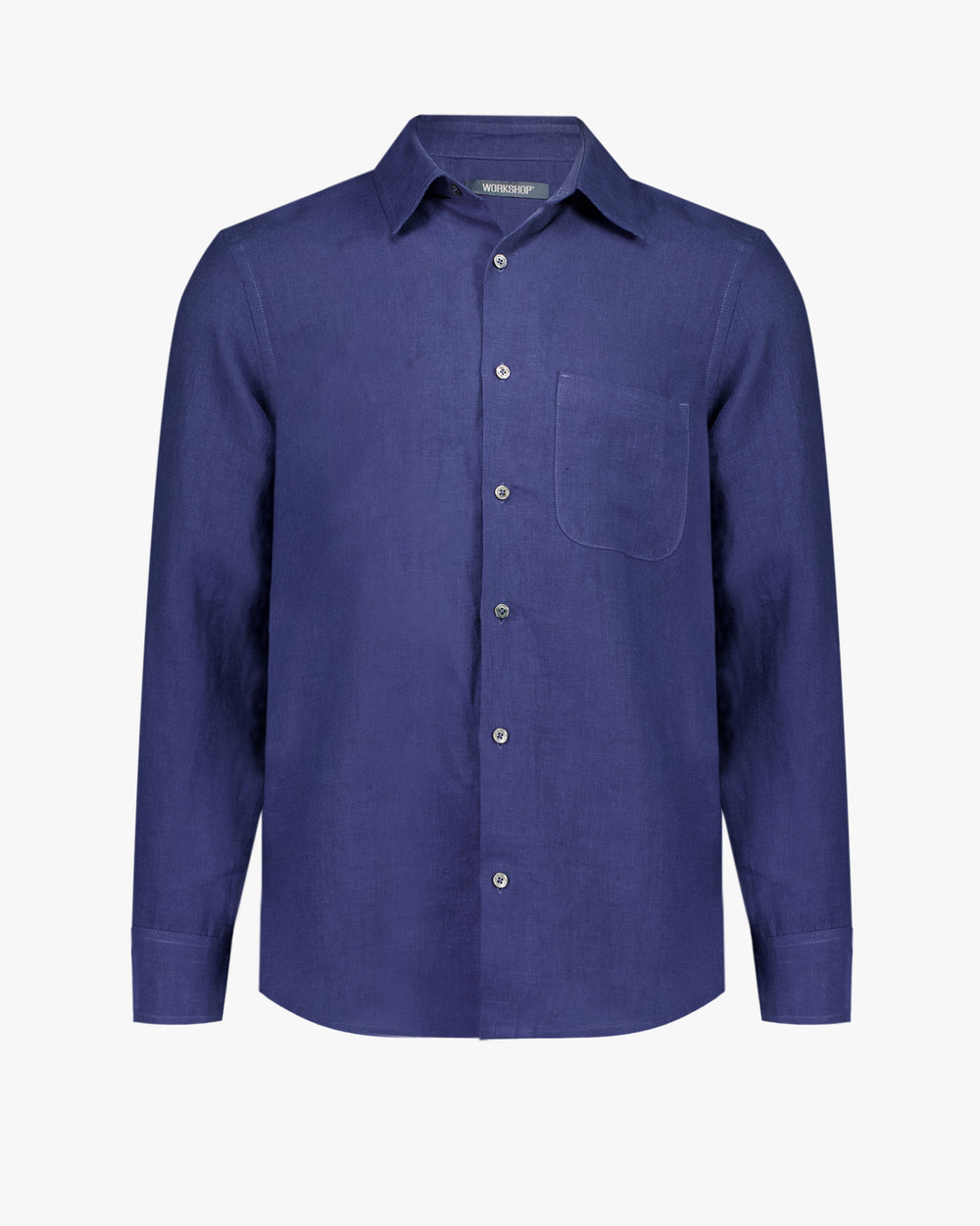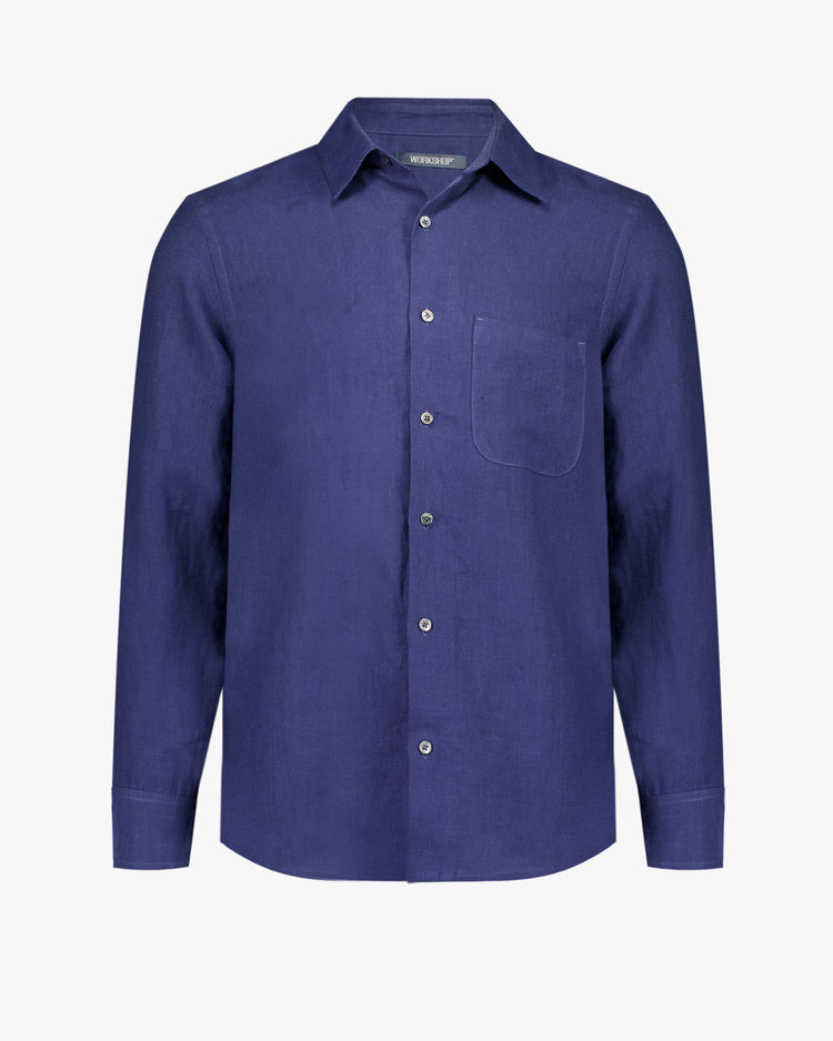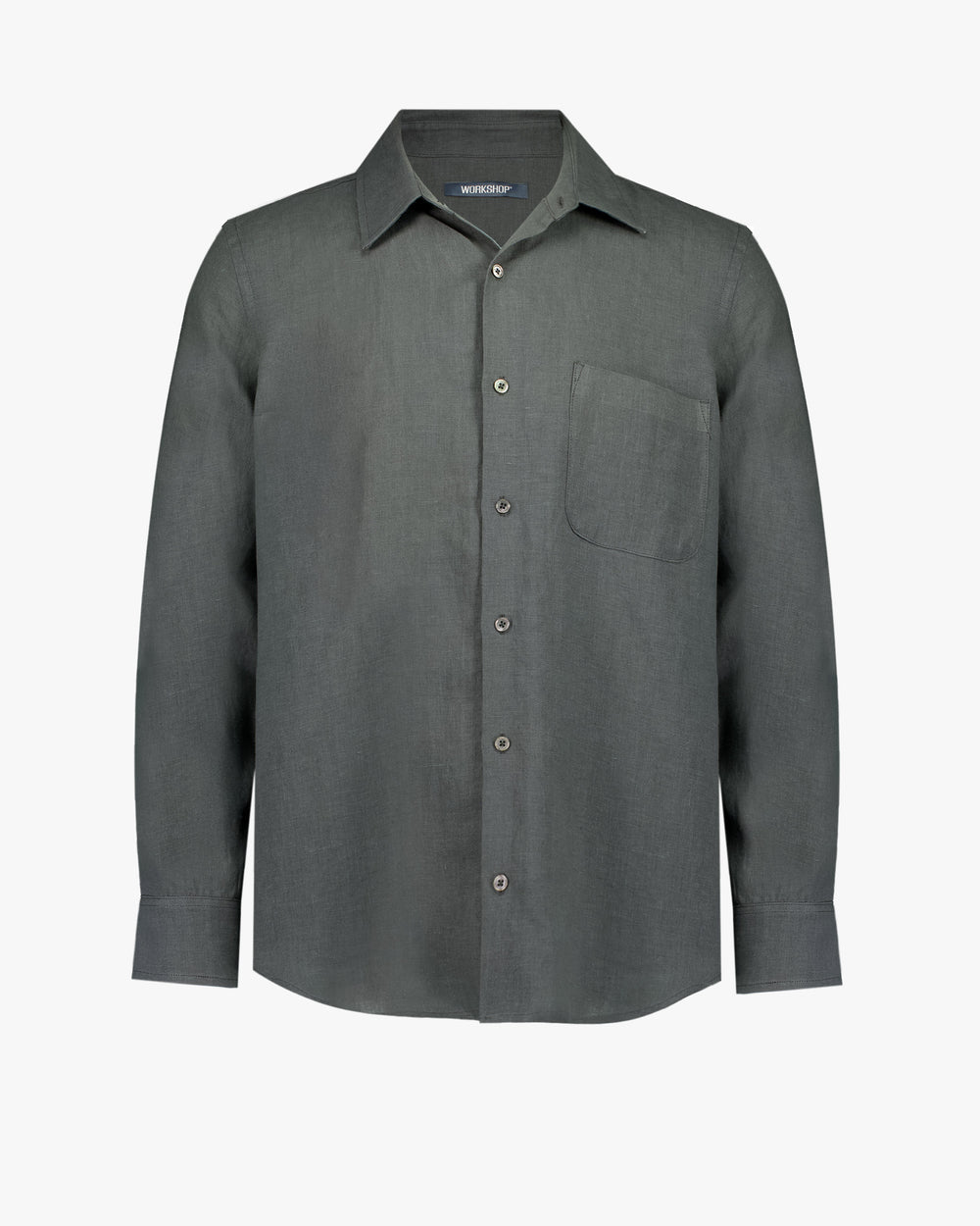 Relaxed fit shirt, cut from a washed linen. Featuring a classic two-piece collar with, front button closure, natural dark shell button, single patch pocket at chest, and long sleeves.