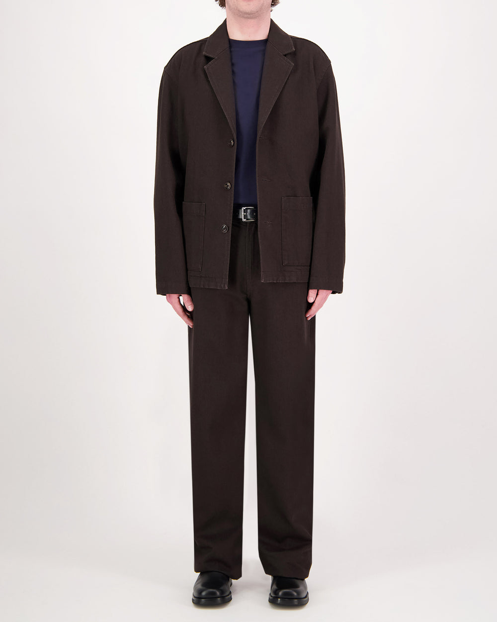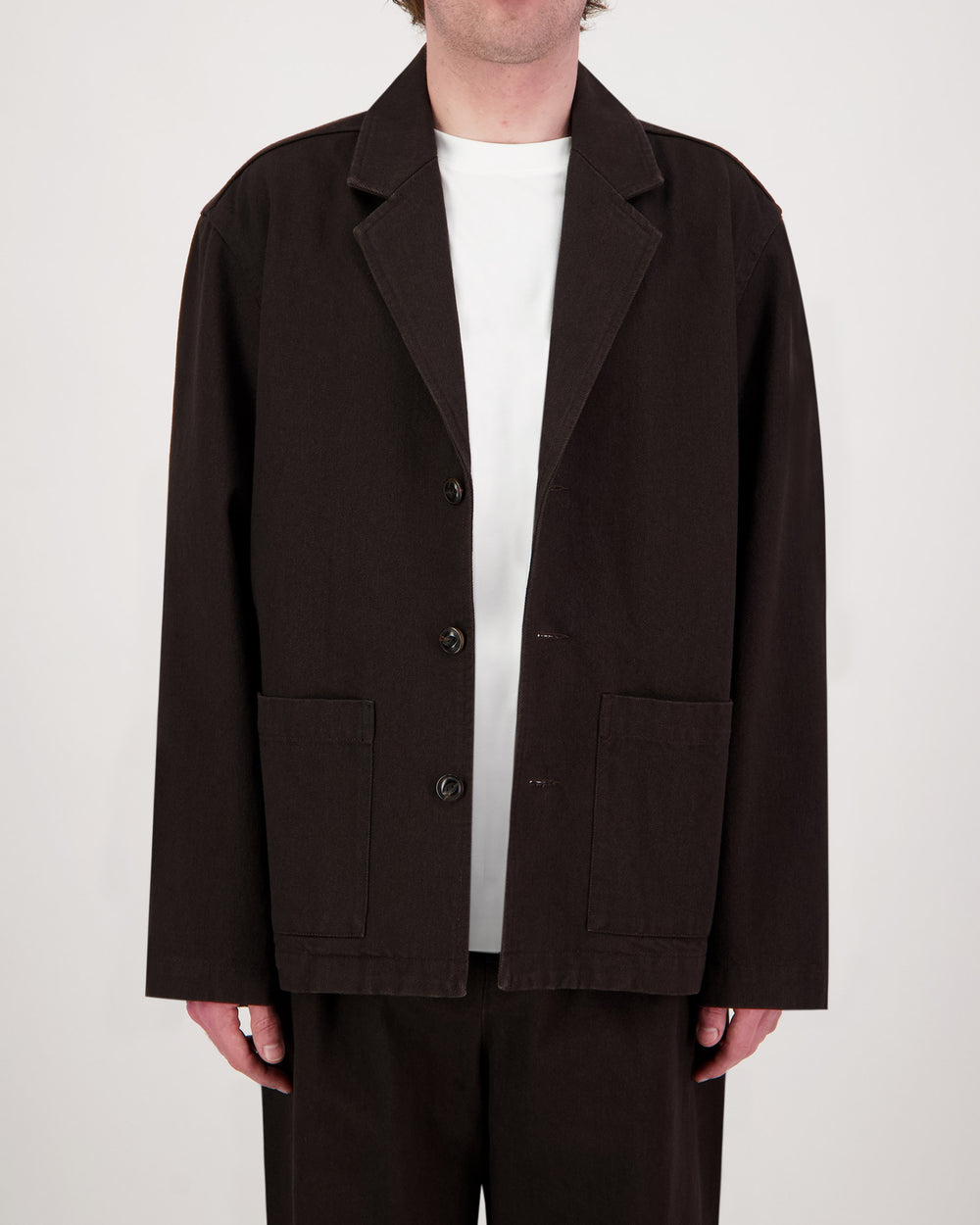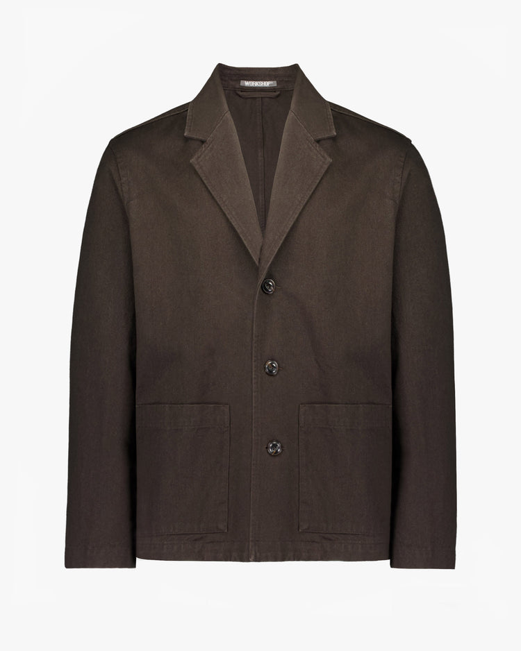 A relaxed take on a 3 Button Jacket, cut from a 12oz Espresso cotton denim. Featuring a a notched collar and lapel, three button closure with natural dark horn buttons, patch pockets at hips, and buttons at sleeve cuffs. Wear as a suit paired with the matching Easy Trouser or Loose fit Trouser in Espresso by Workshop Denim.