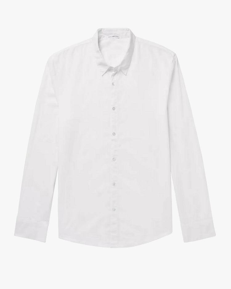 Standard fit shirt, cut from light-weight cotton shirting. Featuring a two-piece collar, classic shirt placket with shell buttons, long sleeves. buttoned shirt cuffs and sleeve placket and shirt tail hem.