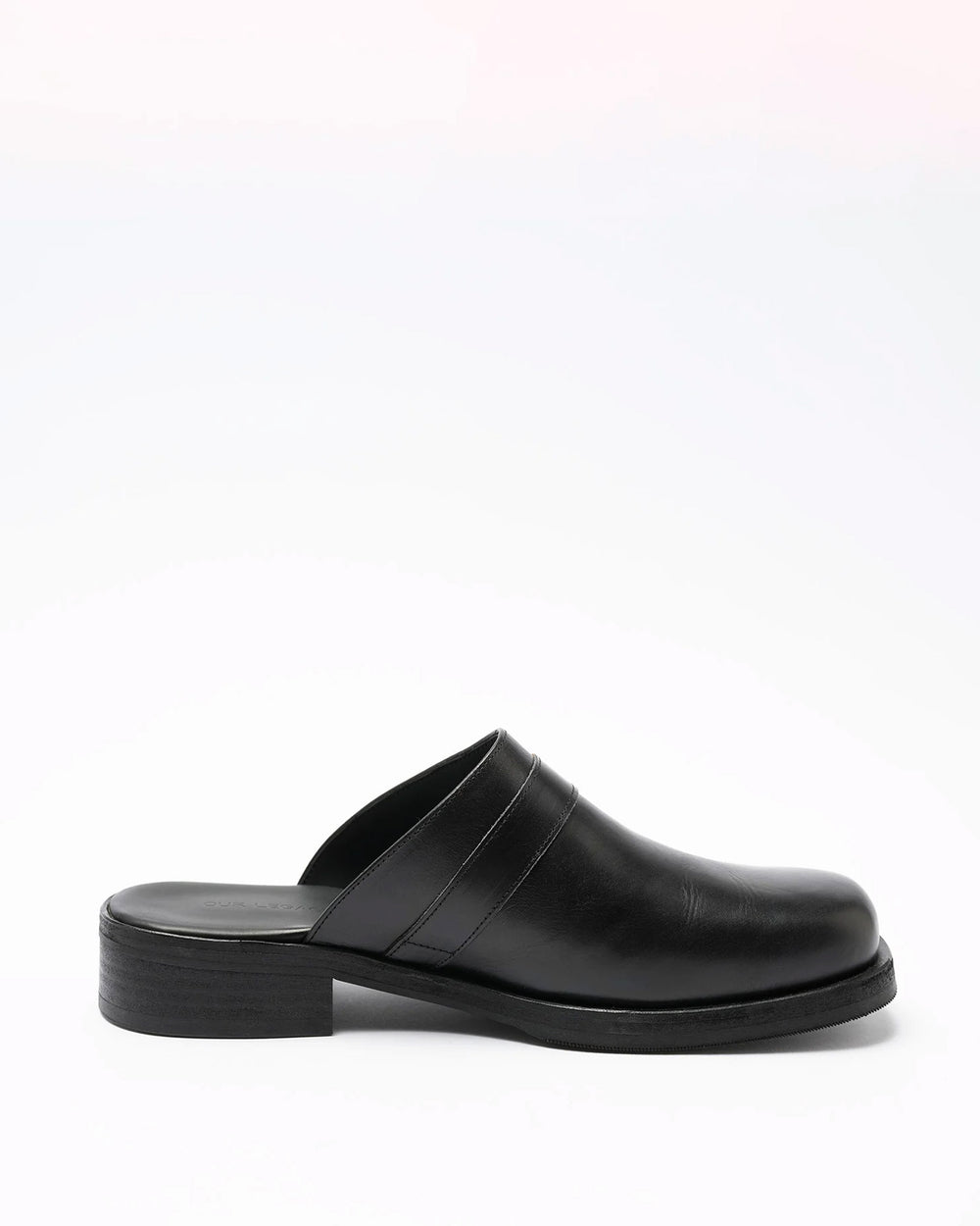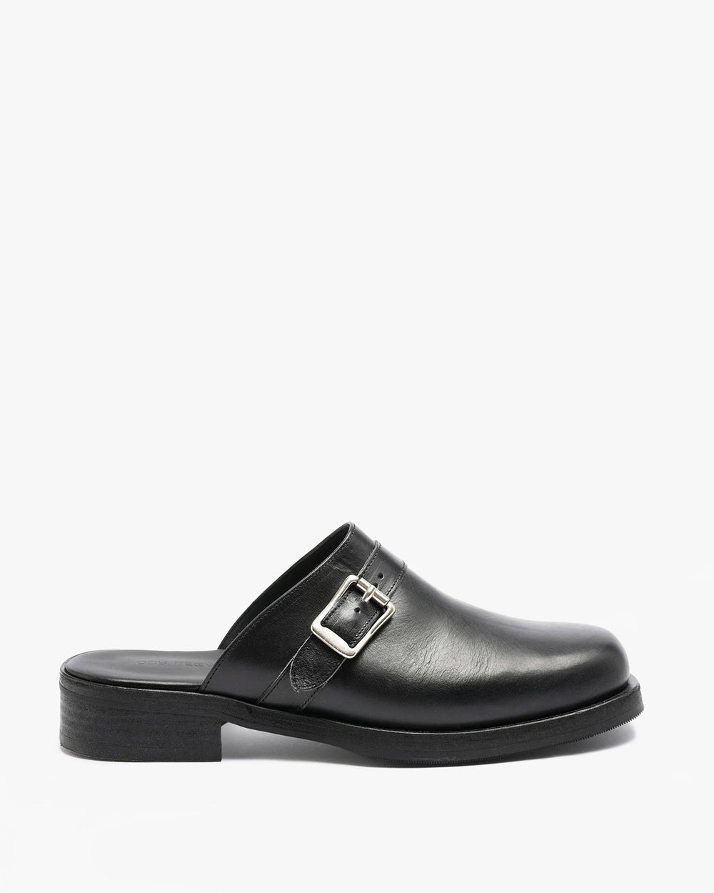 Slip-on style mule, crafted from Portuguese leather. A minimal shape, featuring a cross over strap with brass buckle closure, a rounded square closure, German Kilger leather midsole and Vibram outsole.