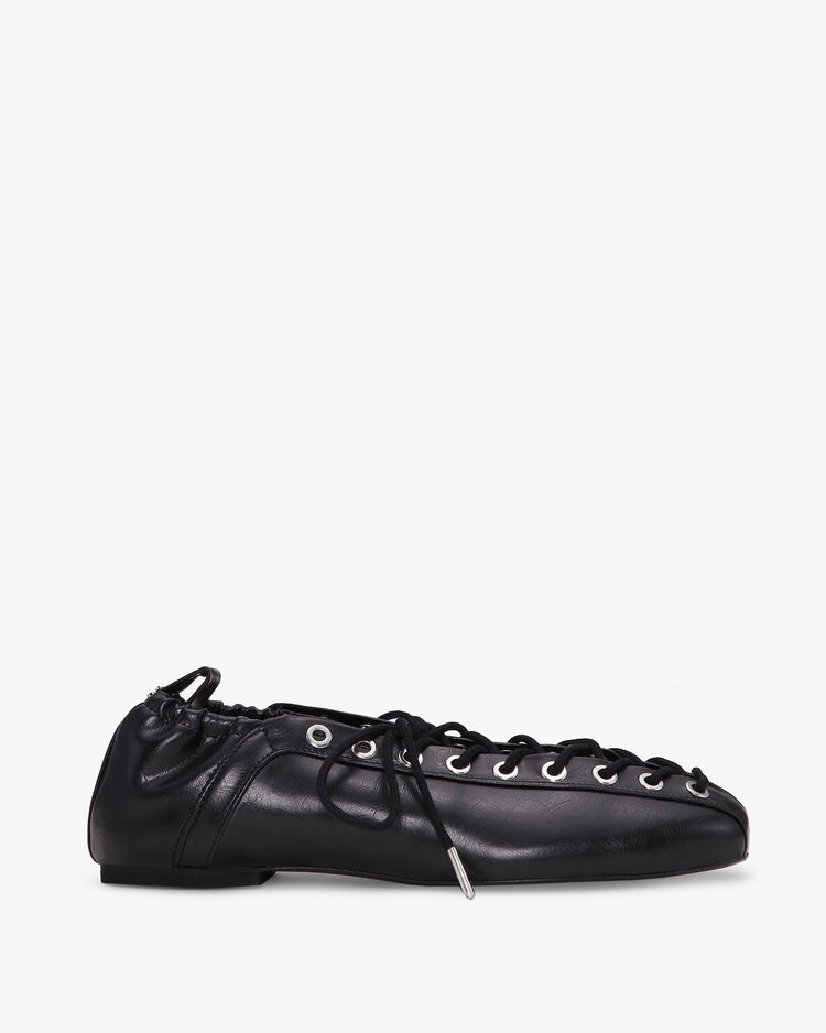 A new Ganni Icon - Lace up ballerina, crafted from a black crinkle Oleatex™. Inspired by 1920's lace up boots, featuring signature silver-toned metal eyelets, cross over wax laces, round toe, elastic heel with pull tab, and metal aglets.