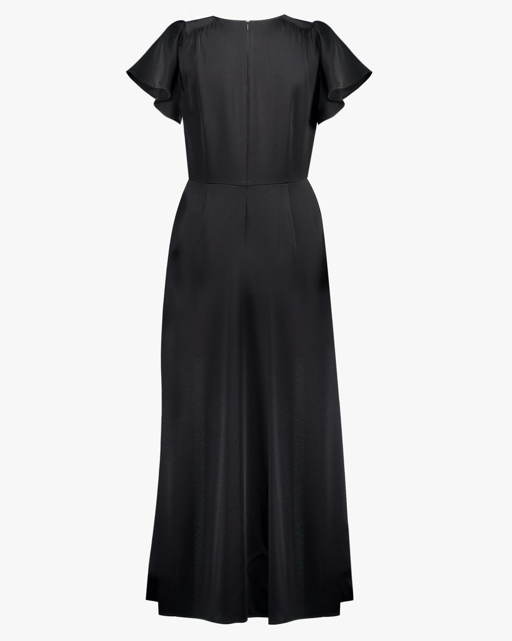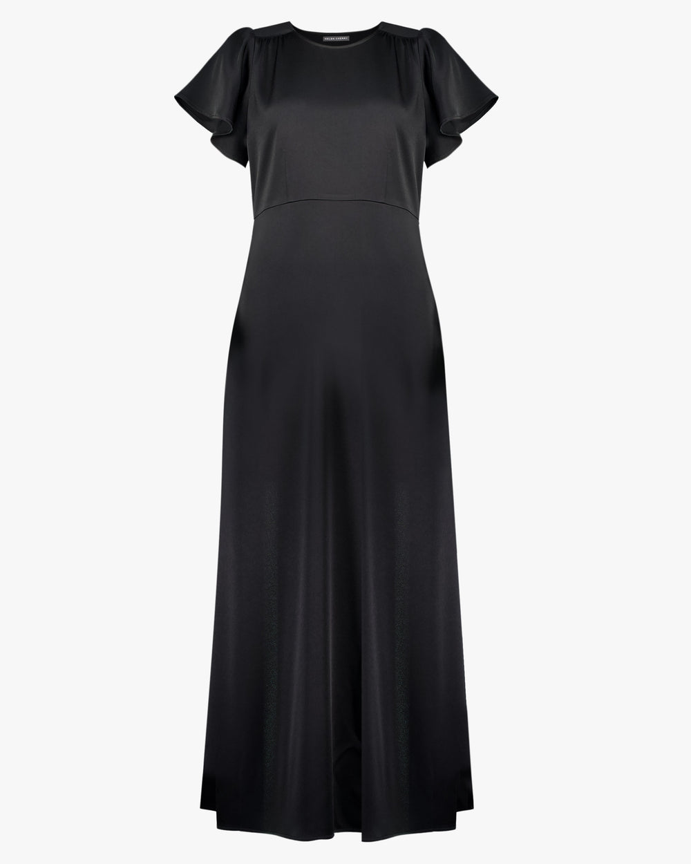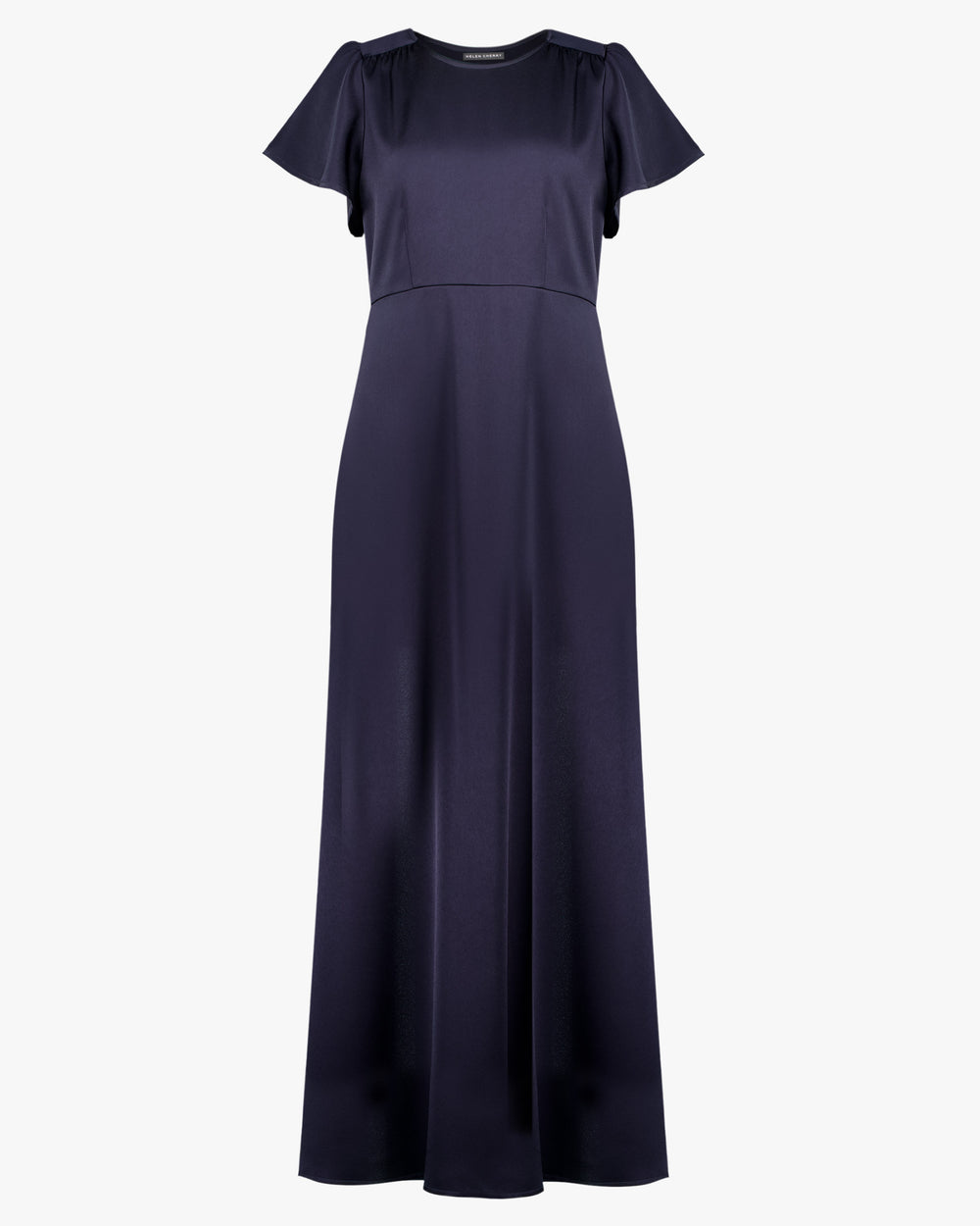 An elegant silhouette, the Lucienne dress bodes a classic fit, crafted from a drapey, luxurious satin in midnight or black. Featuring flared short sleeves with gathered sleeve head and tailored through the waist.