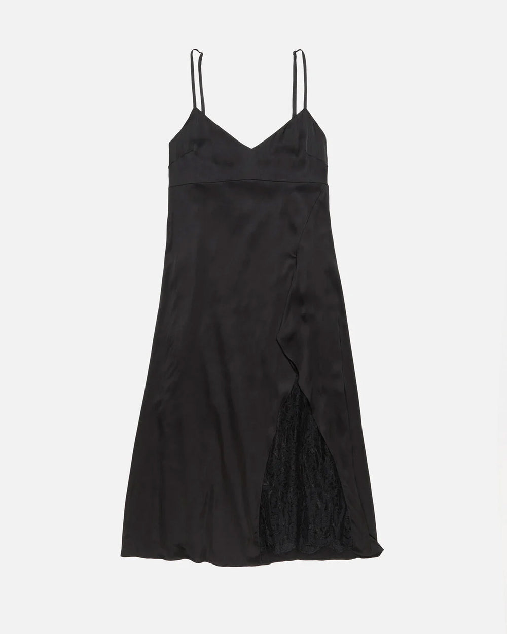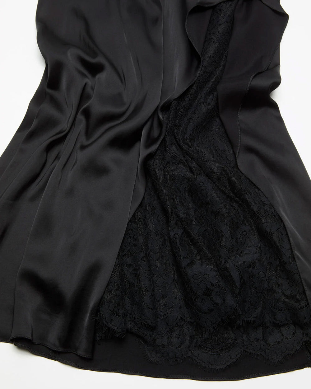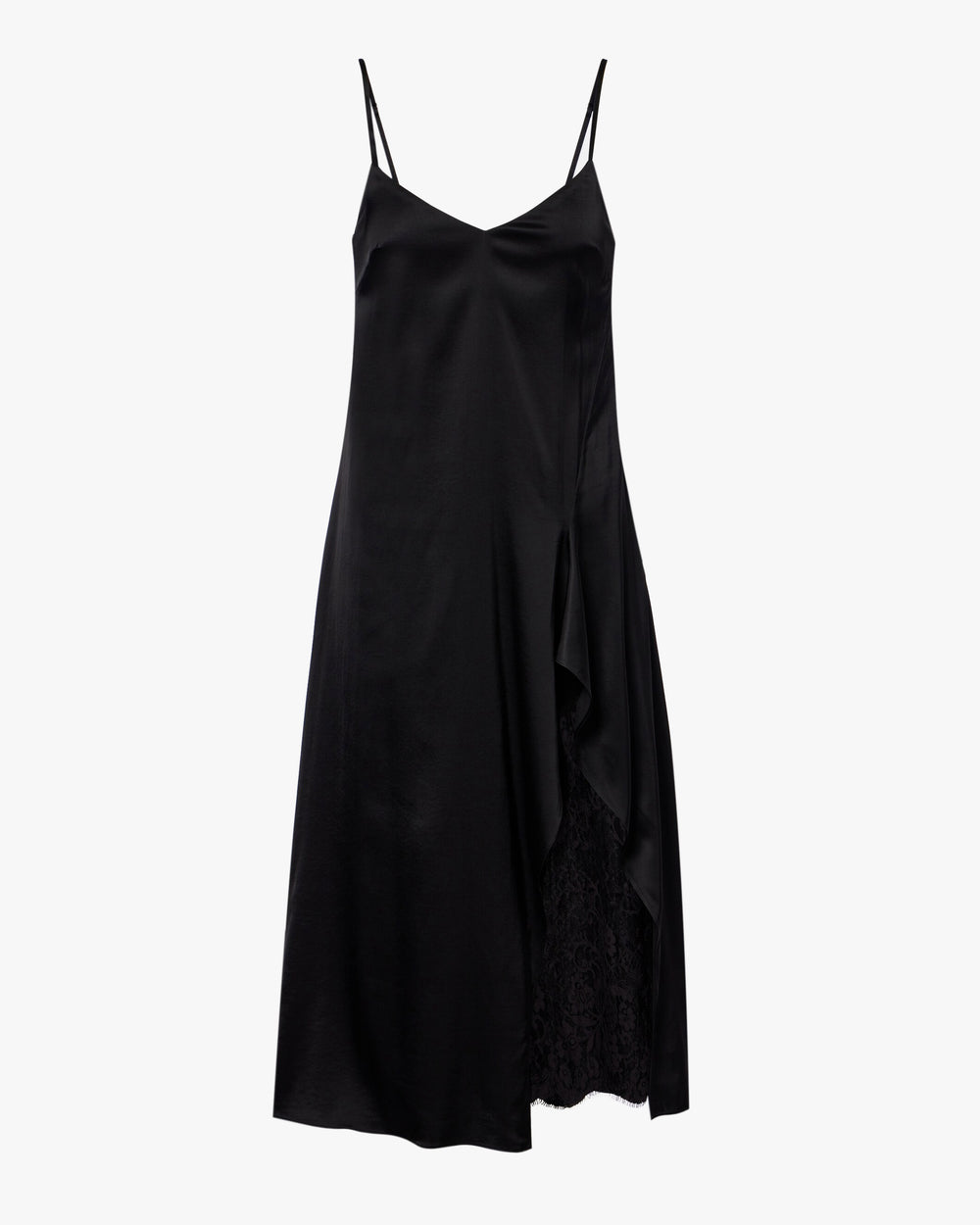 Slip dress crafted from shiny, fluid satin featuring a ruffled slit revealing delicate lace detail. Complete with elasticated adjustable straps and an invisible zip closure. Cut to a fitted silhouette and mid-calf length.