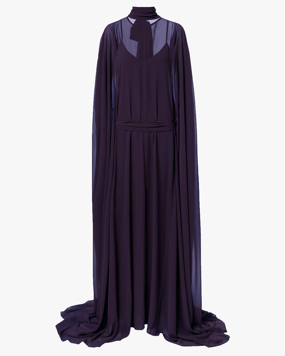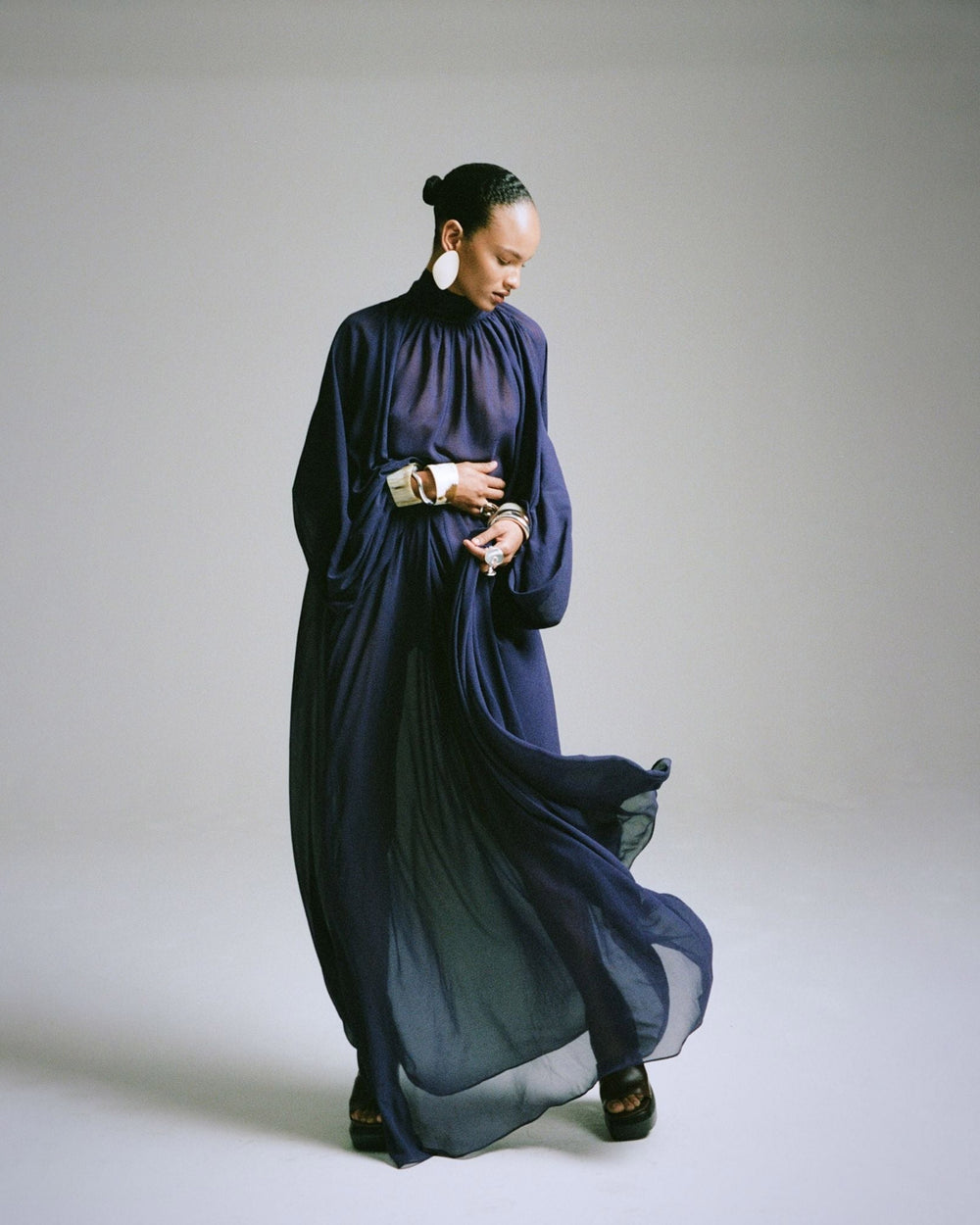 The Nyx Maxi Dress is a floor-length chiffon silhouette defined by volume and fluidity. A softly gathered high neckline gives way to sweeping drape through the body, allowing the fabric to billow and fall with an unhurried grace. Light and expansive, the design moves with air and intention, creating a sense of calm drama that feels both grounded and ethereal.