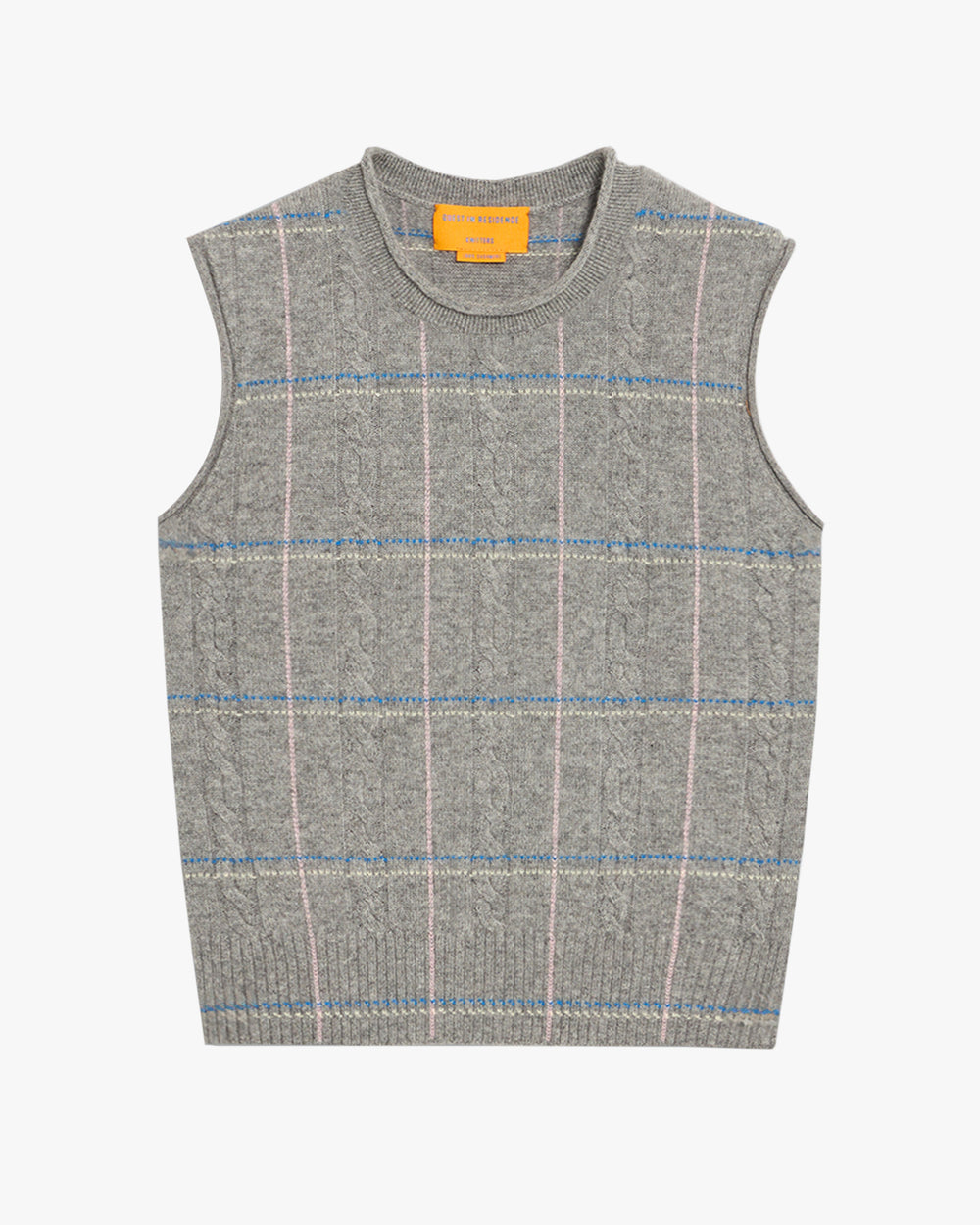 The Check Vest is a women’s cashmere sweater vest crafted from 100% cashmere with a classic check jacquard pattern. Designed with a relaxed fit and mid-weight feel, it’s a versatile layer — style it solo, over a crisp shirt, or under a blazer for an updated classic look.