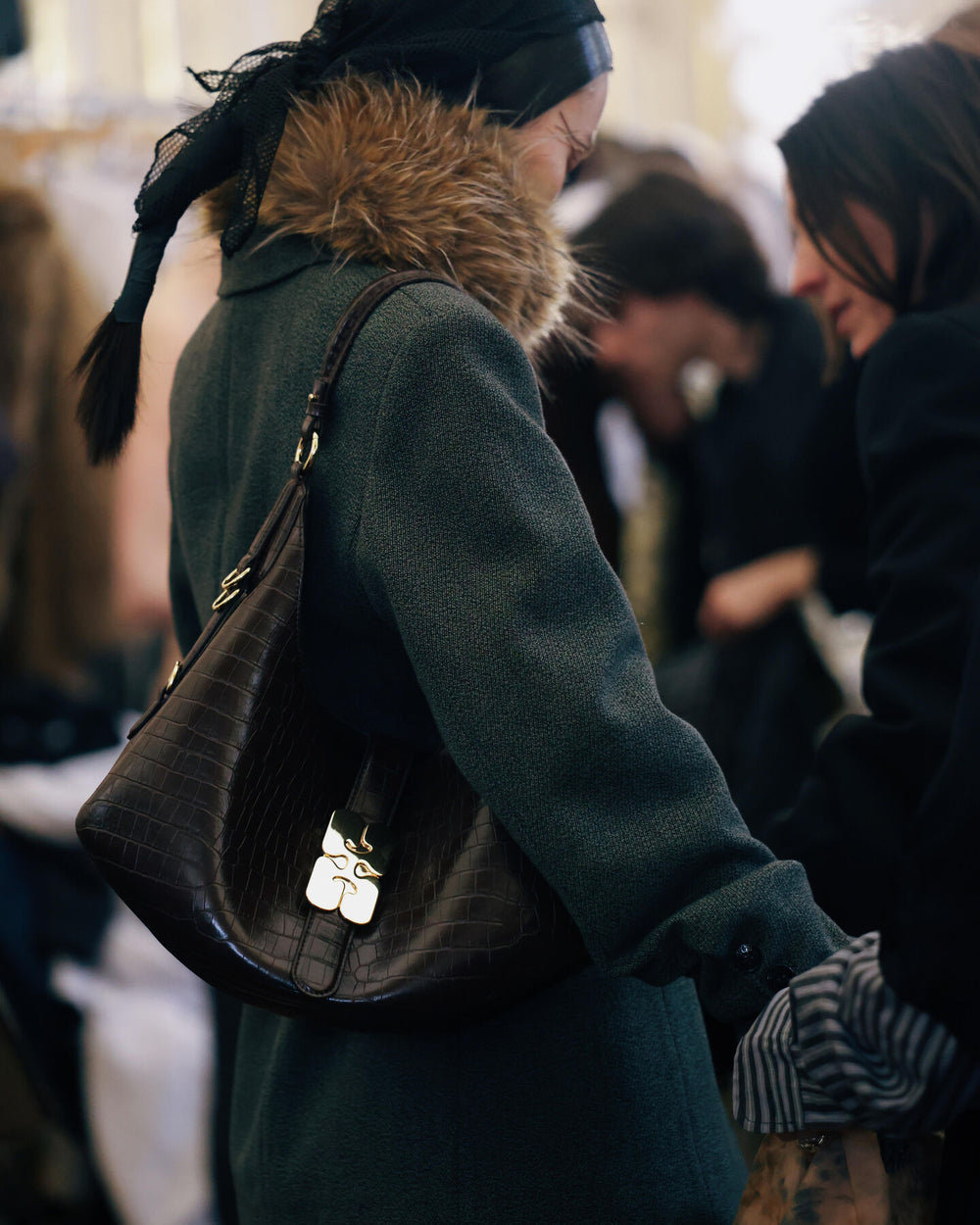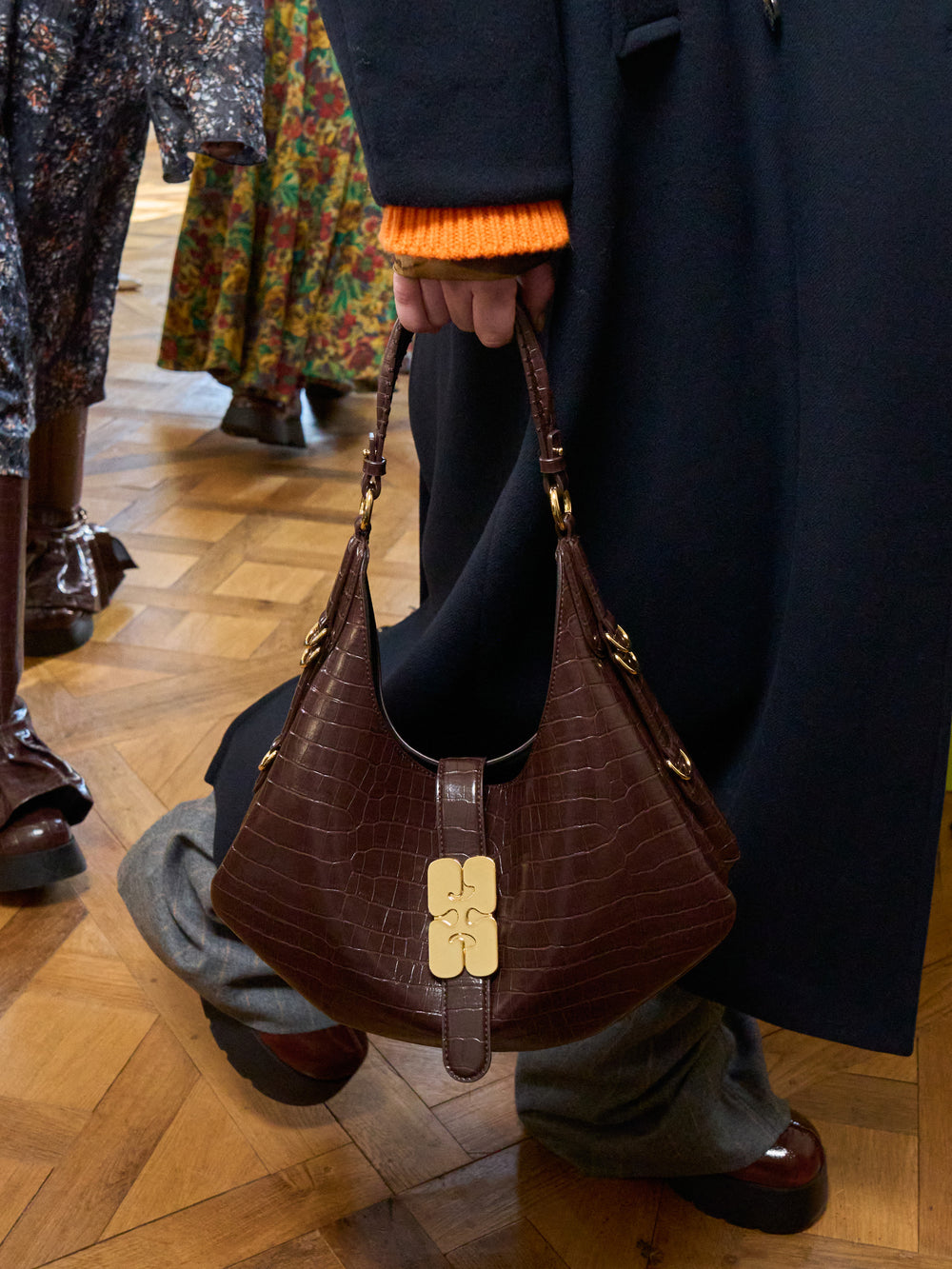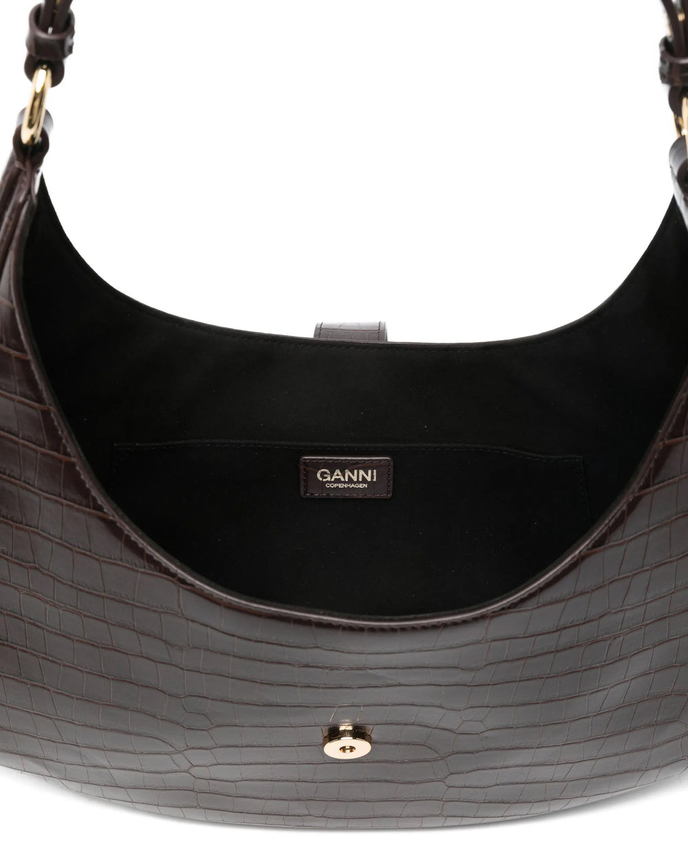 Introducing The Kat Bag in Croco, colour chocolate fondant, as seen on the Ganni Fall-Winter 25 runway. A medium sized top handle bag, crafted from a soft recycled leather. Featuring a soufflet-style silhouette, closure strap with a large gold-toned butterfly clasp closure, and a main compartment.
