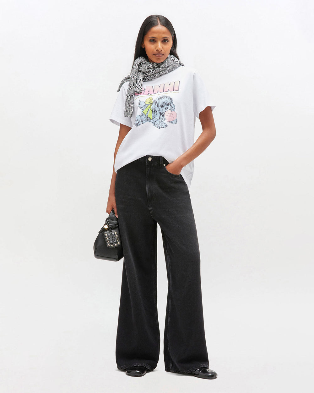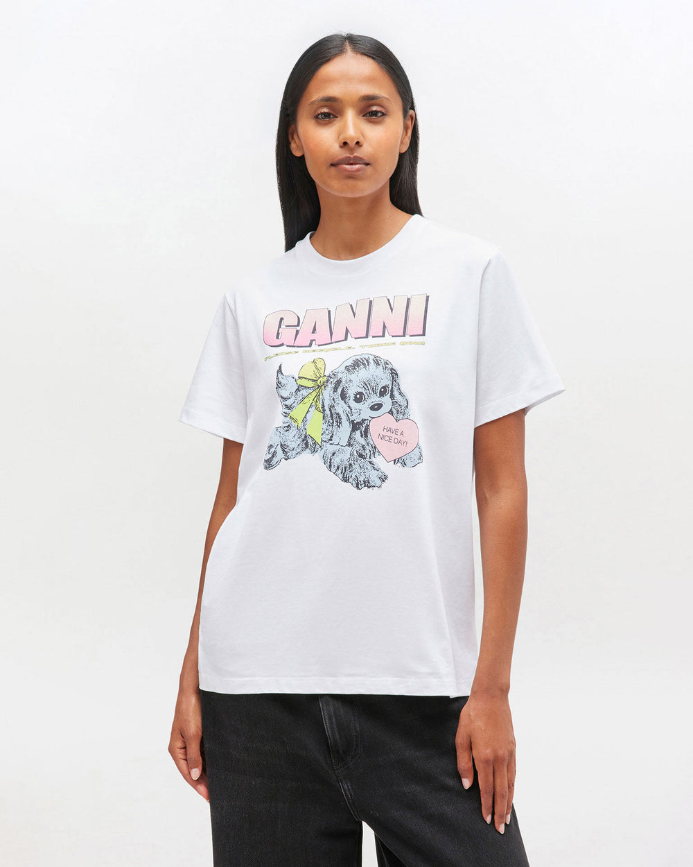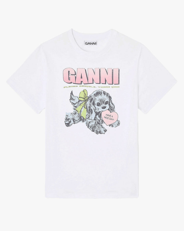 Relaxed fit t-shirt, cut from an organic cotton jersey. The GANNI Neon Puppy T-shirt features a boxy silhouette, crew neckline, short sleeves and printed Ganni logo, and seasonal print on front.