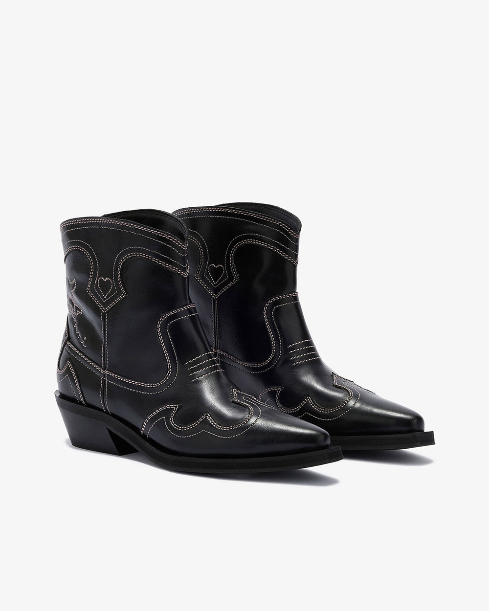 Cowboy boots, crafted from Oleatex™, part of the fabrics of the future initiative. A western inspired silhouette, featuring a mid-calf length, pointed toe, embroidered detailing, curved cuffs, low angled heel and pull tabs.