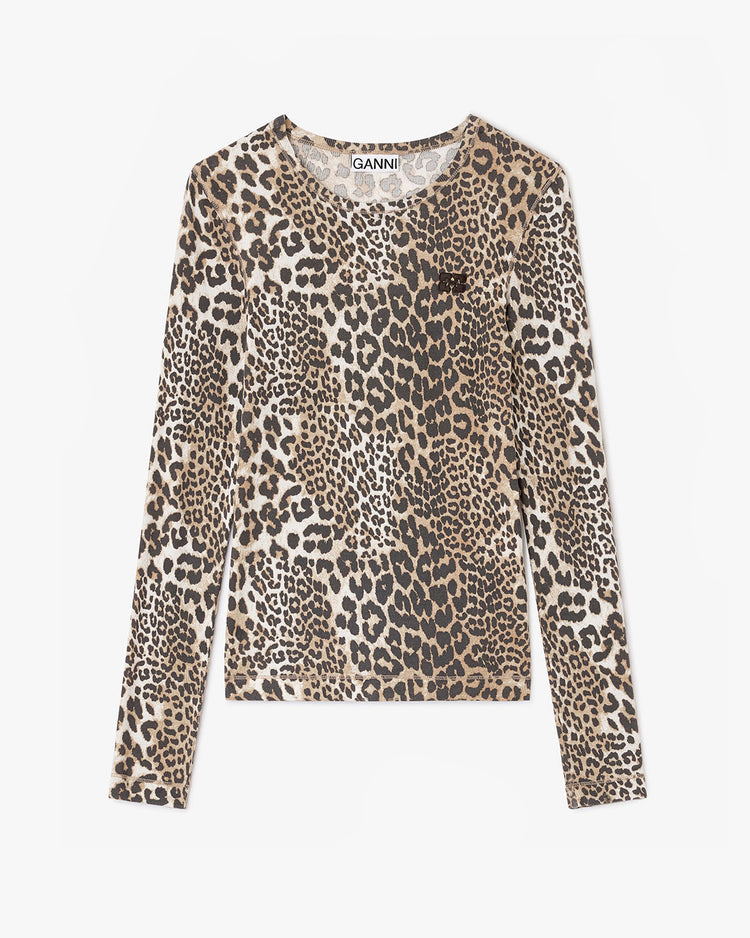 Slim fit long sleeve t-shirt, cut from a leopard printed organic cotton. . Featuring a round neckline, ribbed detailing and GANNI butterfly logo at front.