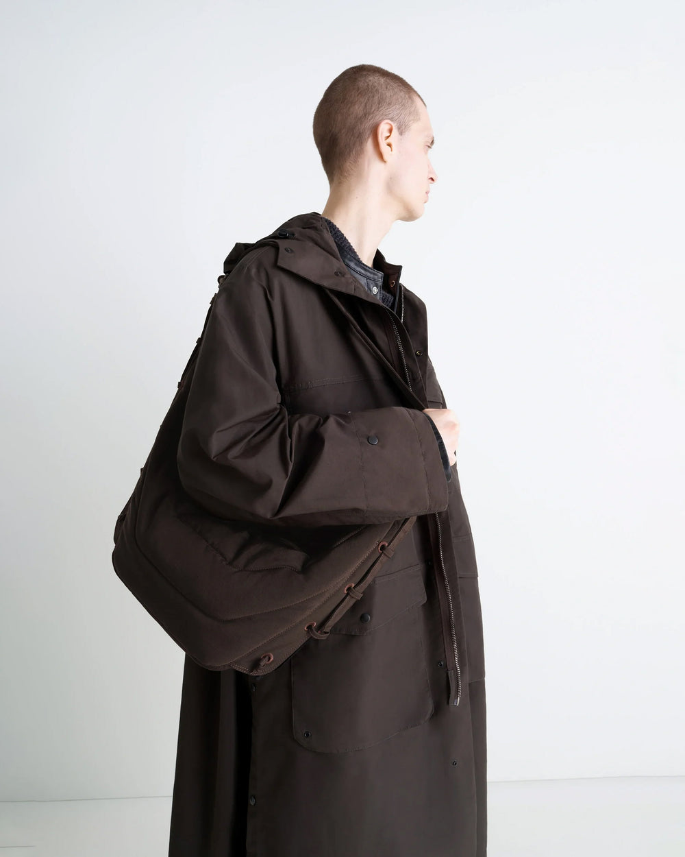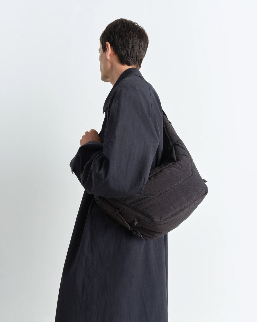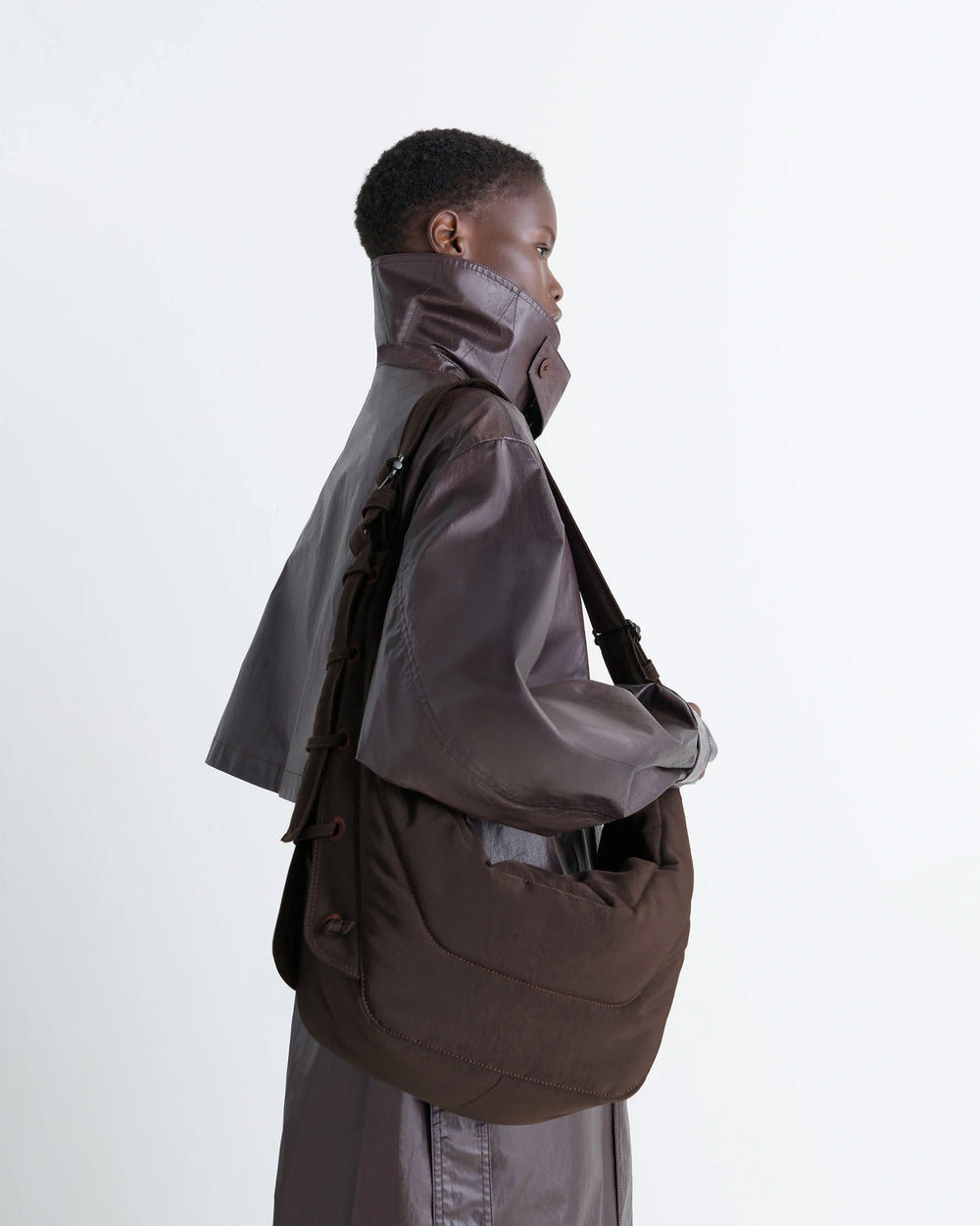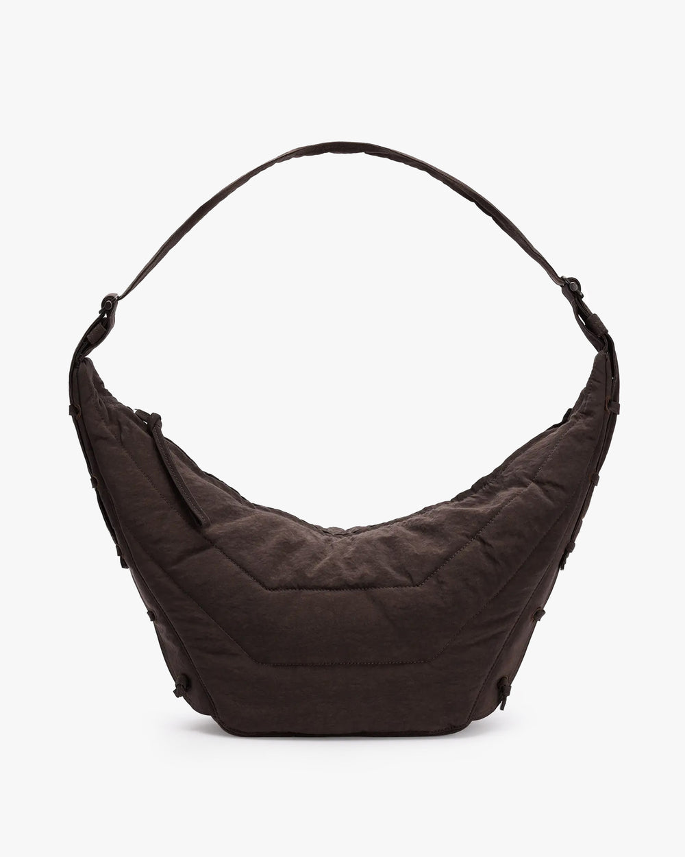Crossbody style unisex bag, crafted from a water-repellent nylon canvas. Inspired by Lemaire's classic Croissant Bag, this is a sturdy structure that holds its shape over time. Featuring a main zip compartment, internal zip pocket, adjustable strap with metal buckle, and embroidered eyelets with self-fabric laces allowing the shape to be adjusted.