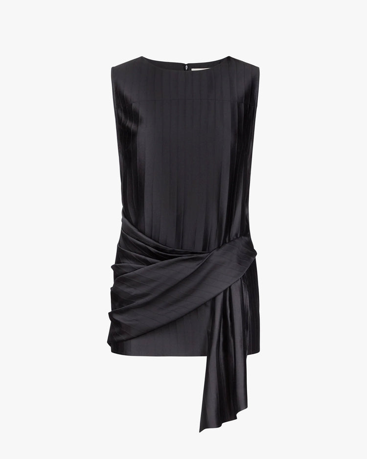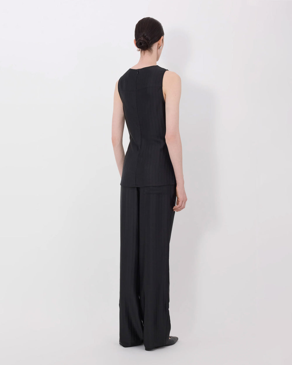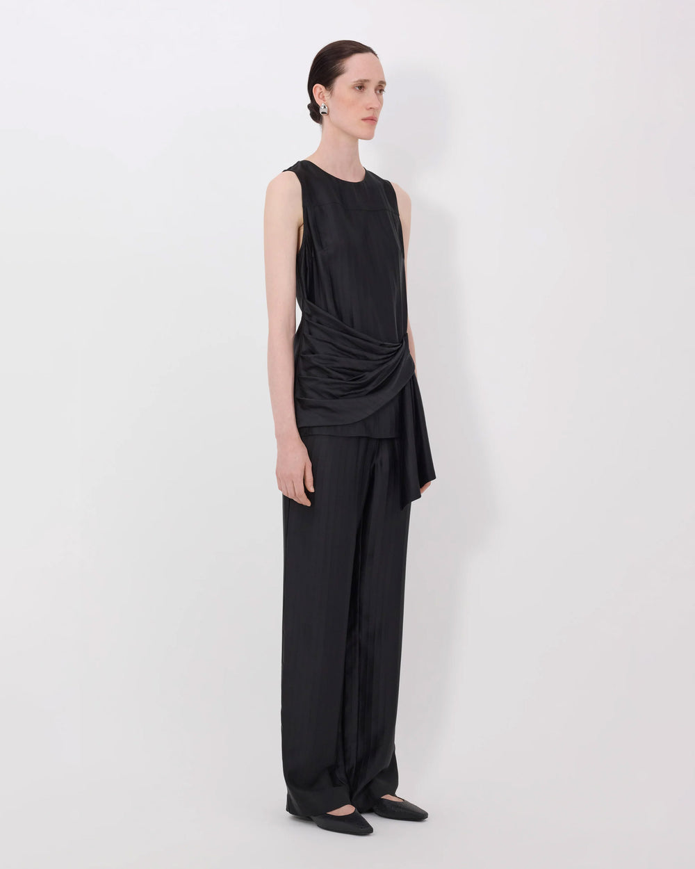 The Fonda top is a classic fit, made of a monochrome striped silk blend. Its long, straight silhouette is accented by hand-draped fabric on the front side, creating a deep, layered effect. It can be worn with the matching Kadala trousers for an elevated total look with a couture spirit.