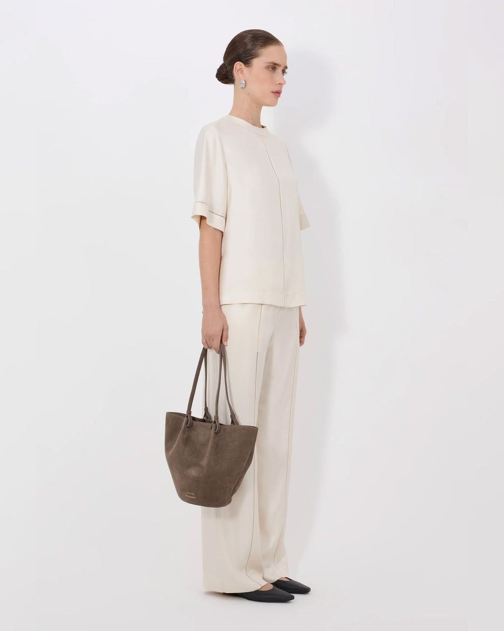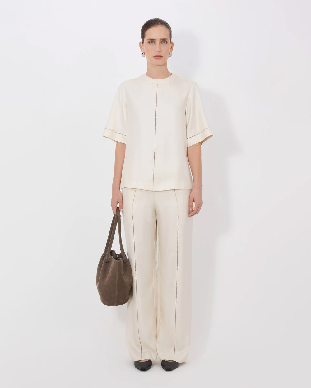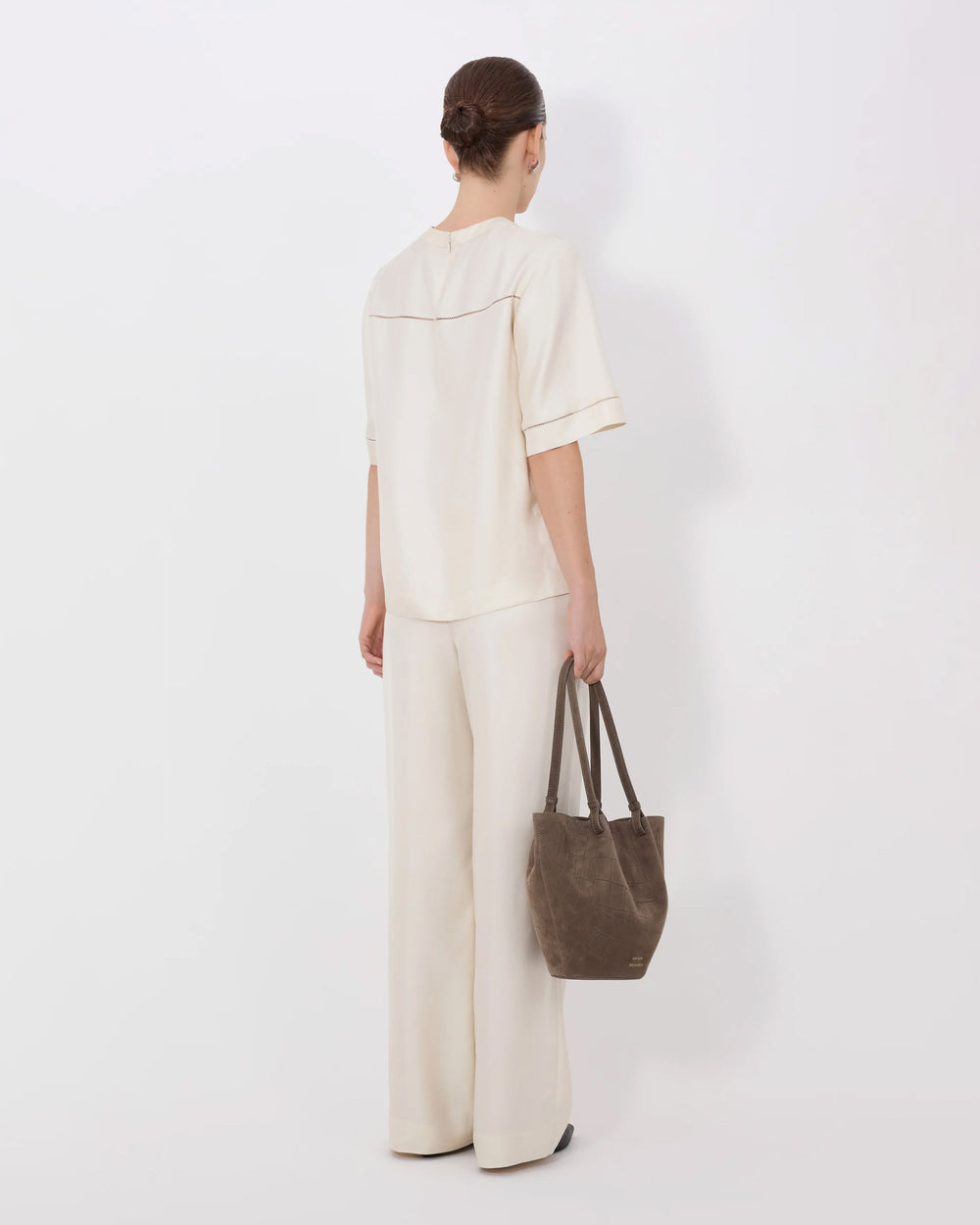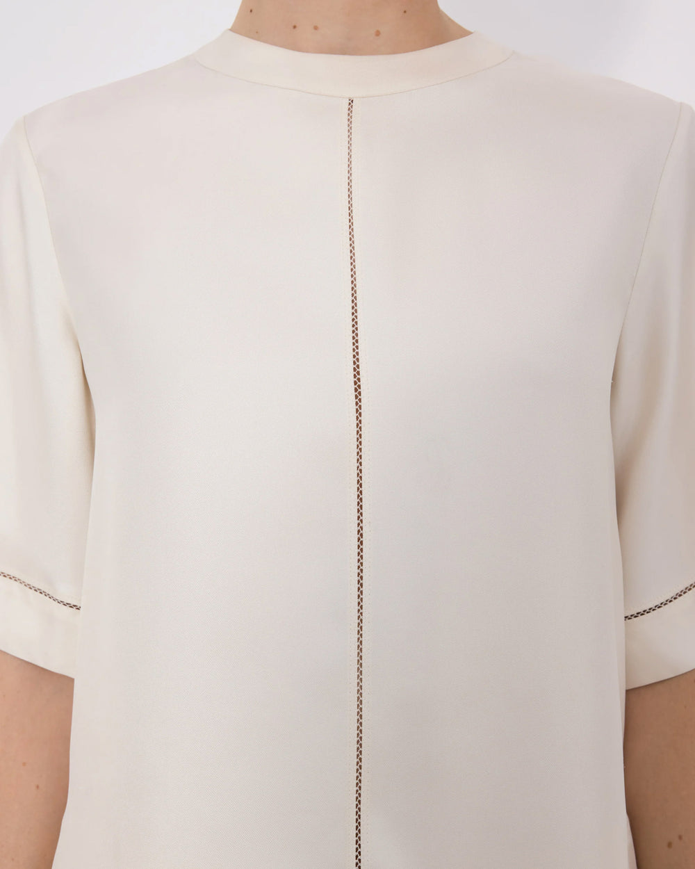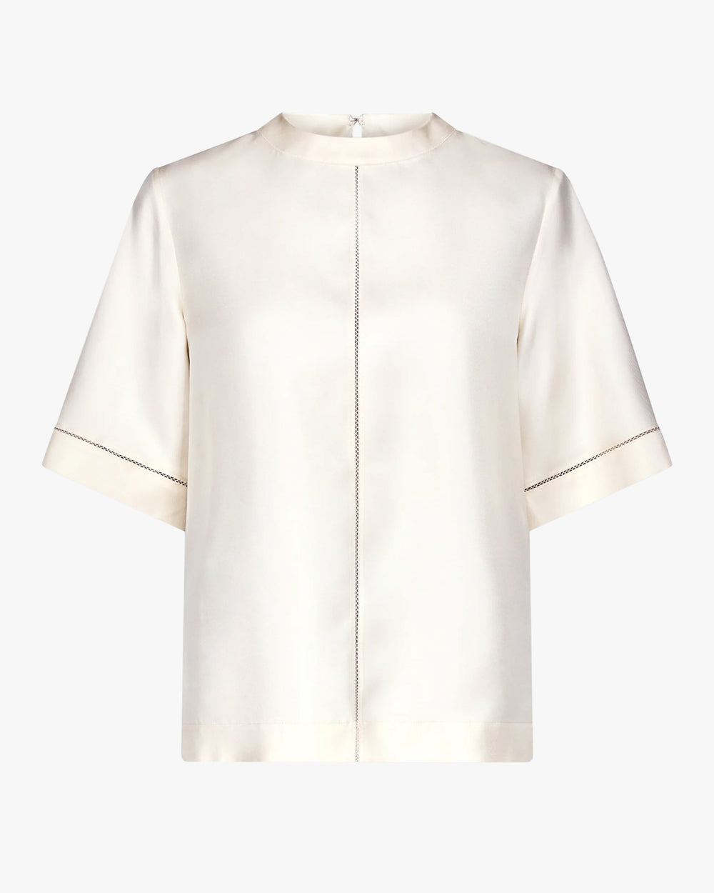 Relaxed fit t-shirt, cut from a pure silk twill. A boxy silhouette, featuring a high round neckline, lace-stitch detailing at the center front, sleeves, and along the back, elbow length wide sleeves, and a center back invisible zip closure. It can be styled with the matching Lars trousers for a sophisticated effortless look.