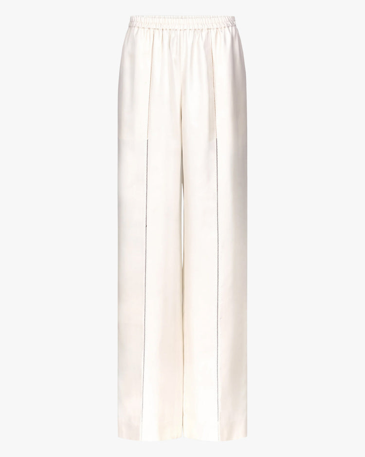 Relaxed fit trousers cut from a pure silk twill. Featuring a wide leg, side seam pockets, a mid-rise elasticated waistband accented with lace-stitch details on the front legs. They can be styled with the matching Havana top for a sophisticated effortless look.