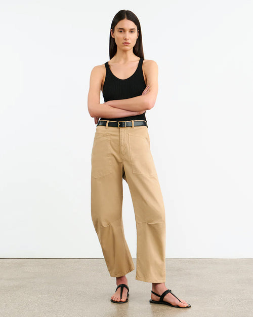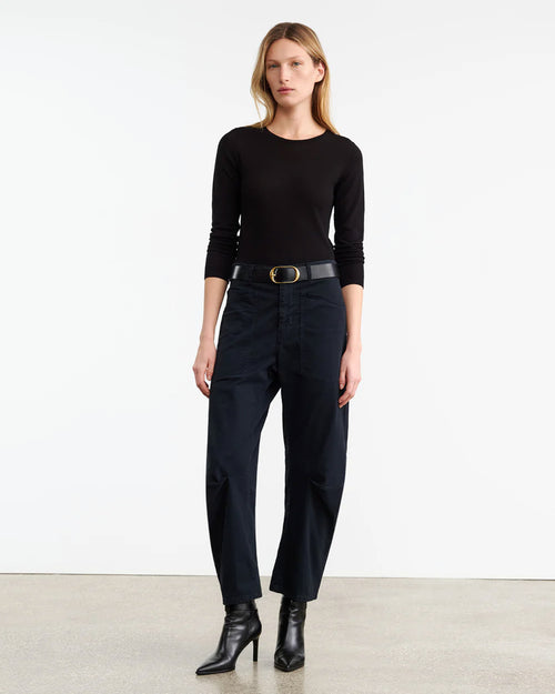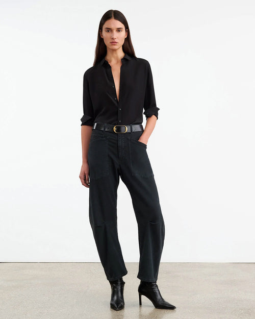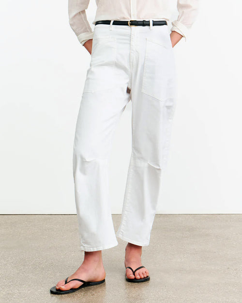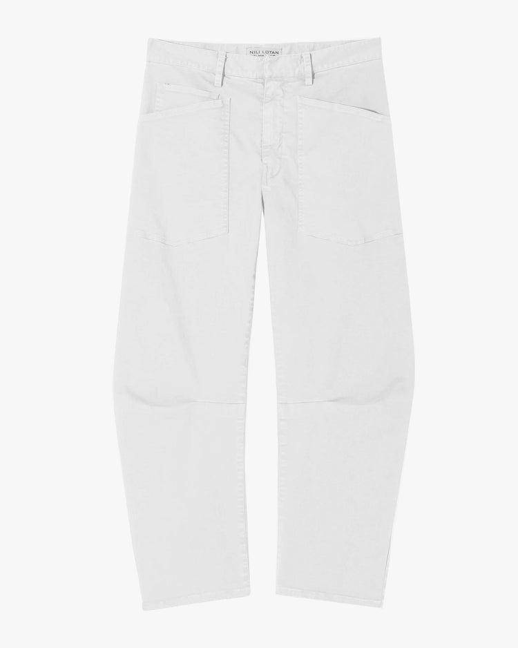 The Iconic Nili Lotan Shon pant in white returns for High-Summer. Relaxed fit pant, cut from an Italian washed stretch cotton. A unique curved leg silhouette achieved by strategically placed pleats at the inner knee, and oversized patch pockets at front and back.