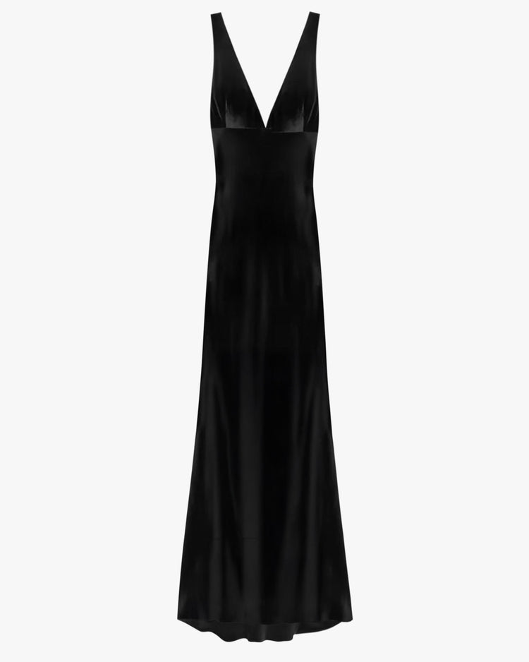 Elegant fitted dress, cut from 100% silk. The Bionca dress is a full length silhouette, featuring a plunging neckline, darts at bust for shape and a fitted body.