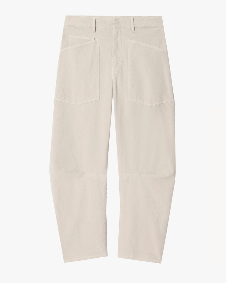 A Nili Lotan icon. The 'Shon Pant' is a relaxed barrel fit, cut from an Italian stretch cotton corduroy. A unique curved leg silhouette achieved by strategically placed pleats at the inner knee, and oversized patch pockets at front and back.