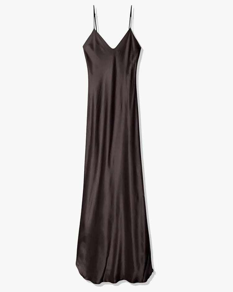 Elegant slim fit dress, bias cut from a silk charmeuse. Floor length, featuring a scoop neckline, adjustable spaghetti straps, and shirt detail at hem.