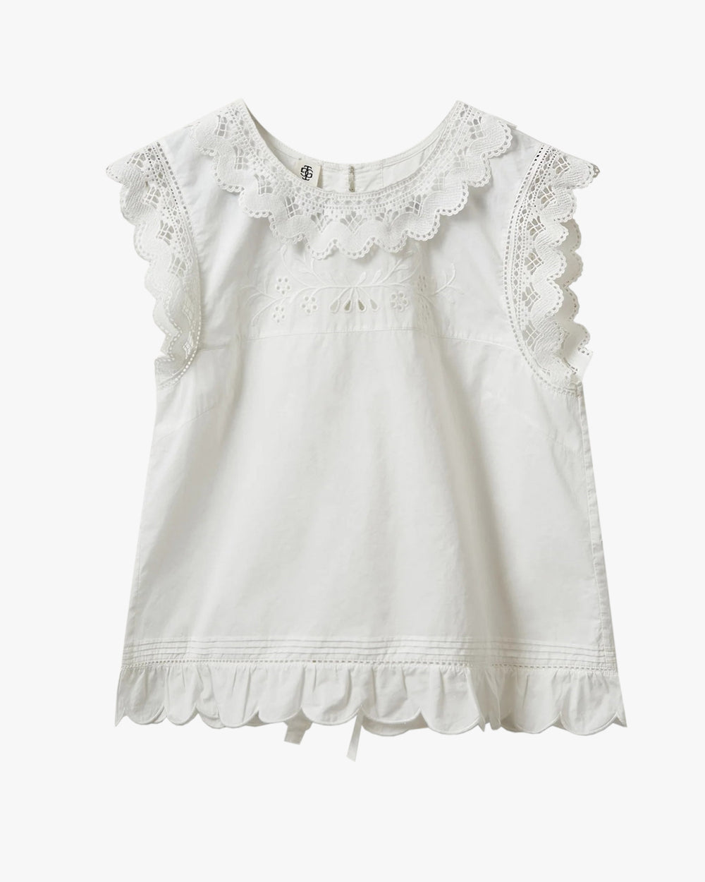 Relaxed fit top, cut from organic cotton. The Kirsten cloth top is a sleeveless silhouette, featuring a round neckline, lace detail, scalloped edges and bow tie closure at back. An addition to the 'Kirsten' line by The Garment, wear as a set paired with the Kirsten pants in white.