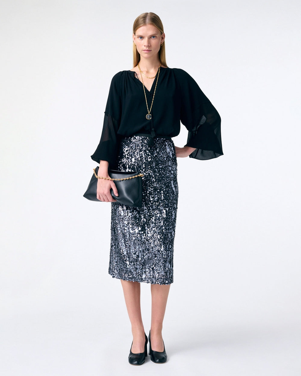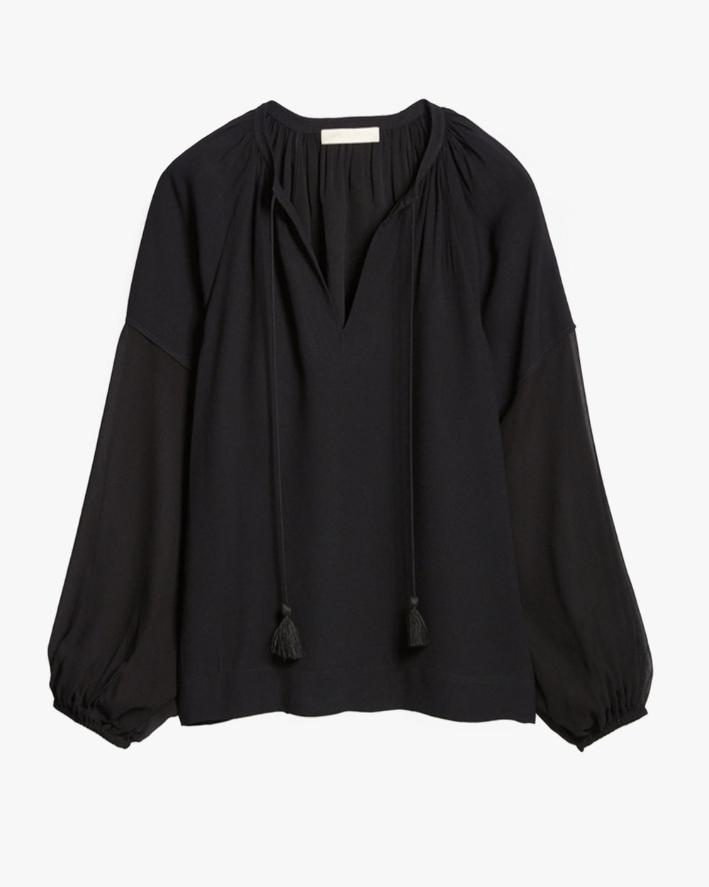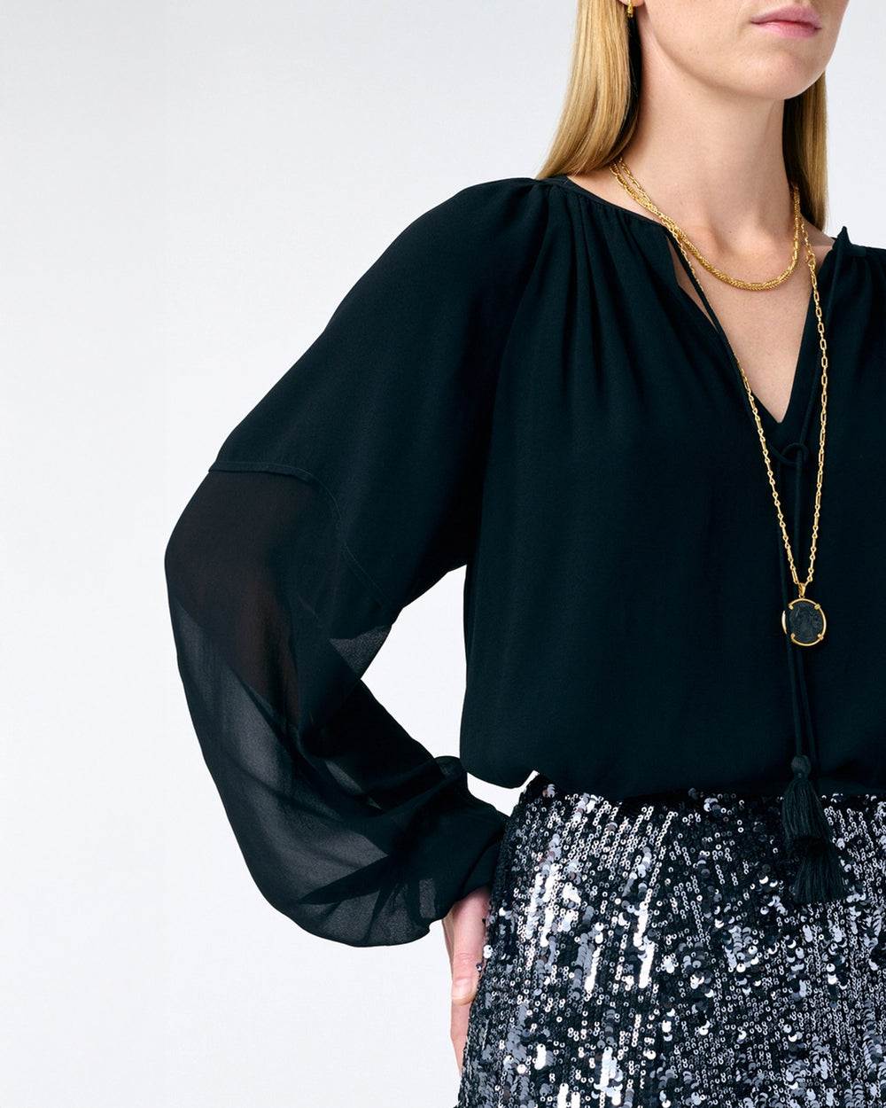 Relaxed fit blouse, cut from a viscose voile. Featuring voile sleeves and slit neckline, the Dylan blouse plays on contrasting materials for a look that is both understated and sophisticated. An ideal piece for both day and evening wear.