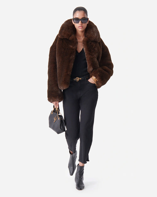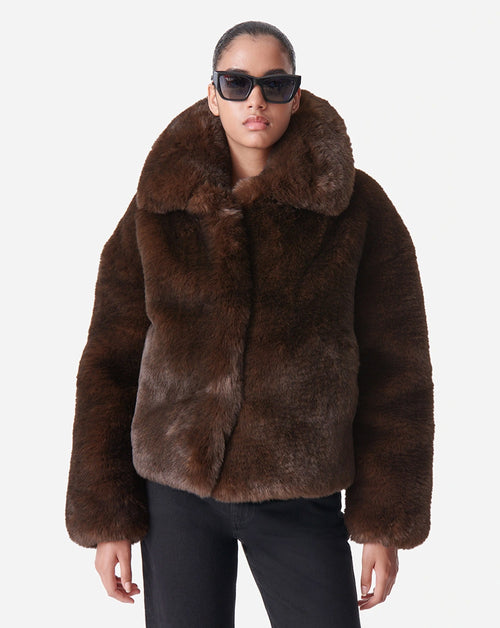 Oversized fit jacket cut from an incredibly chic, comfortable and warm polyester faux fur. Featuring a large lapel collar, and an open front with a concealed hook and eye closure.