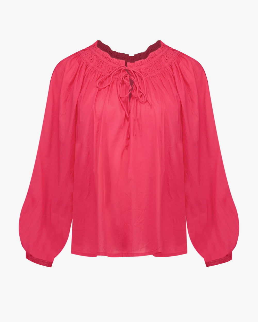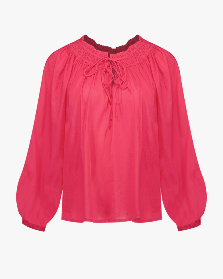 - Gathered neckline with tie fastening