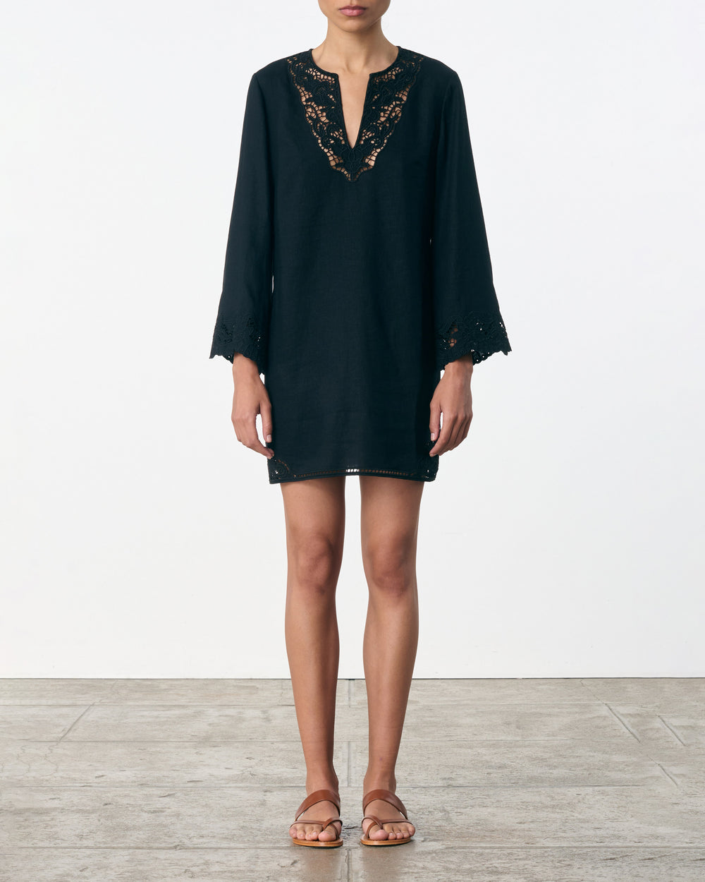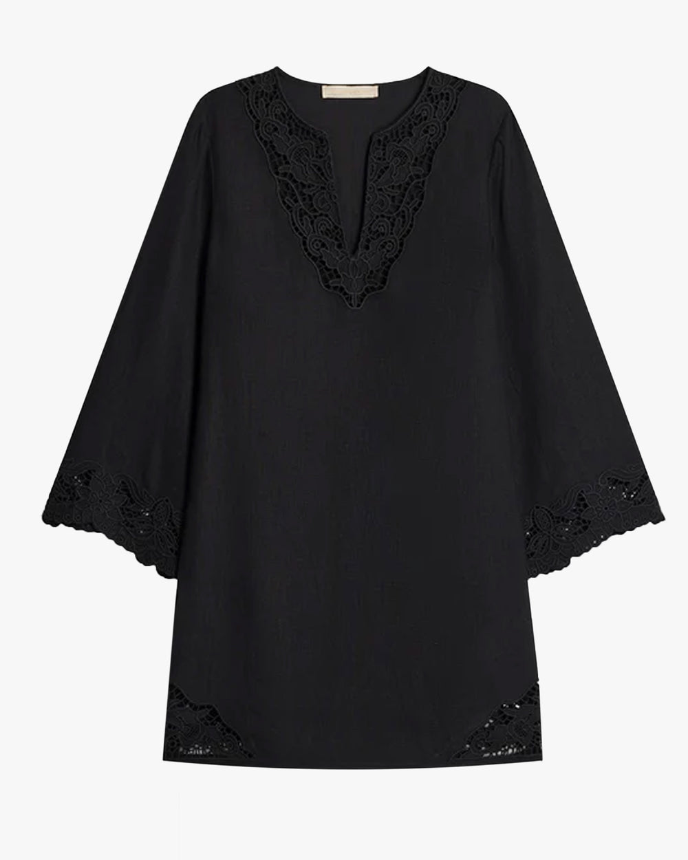 Relaxed-fit dress cut from a lightweight linen and viscose blend, featuring a Tunisian neckline, three-quarter sleeves with lace trims, and a flattering mini length. Finished with intricate lace details.