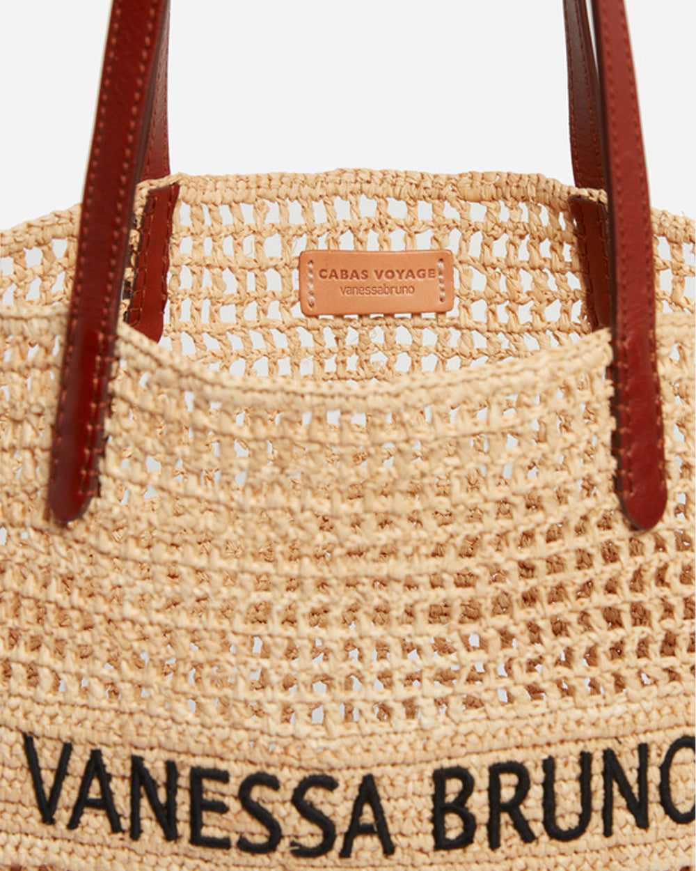 Handwoven raffia basket featuring dual leather handles, elegant black cotton ‘Vanessa Bruno’ embroidery, and a comfortable shoulder‑carry design. The elegant raffia basket is an essential accessory—both stylish and practical—perfect for accompanying all your outings