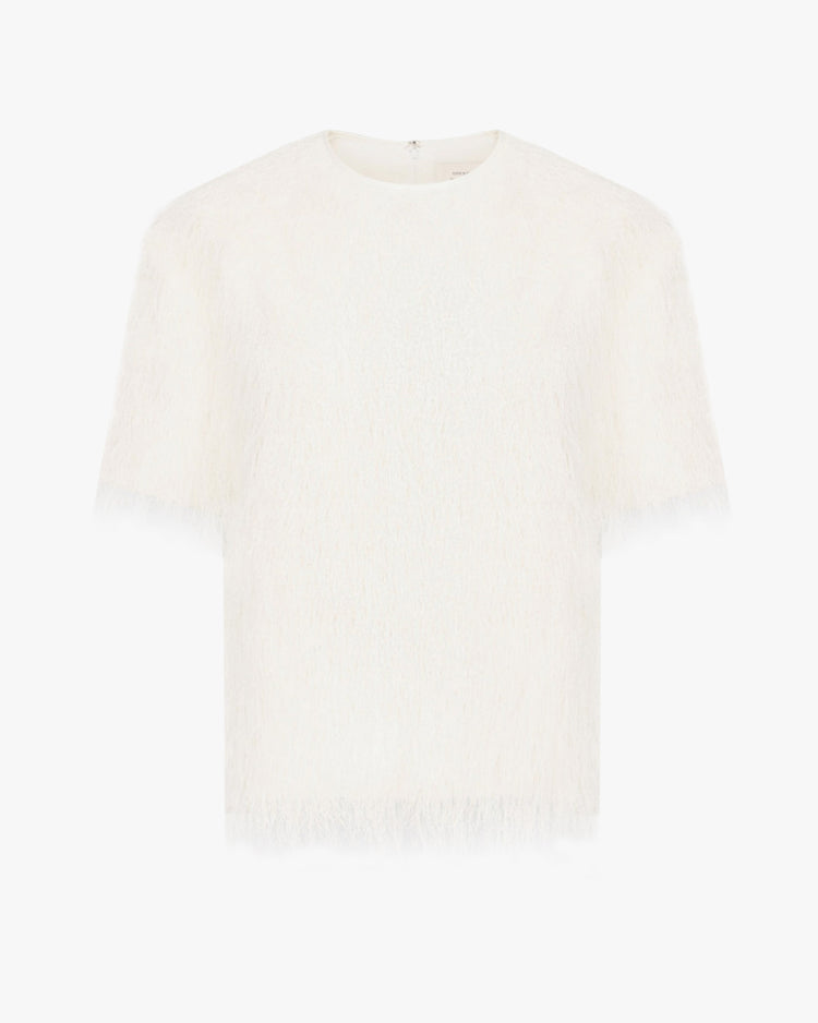 Relaxed fit top, made from long fringed fabric. An elevated, straight cut silhouette, featuring a crew neckline and short sleeves.
