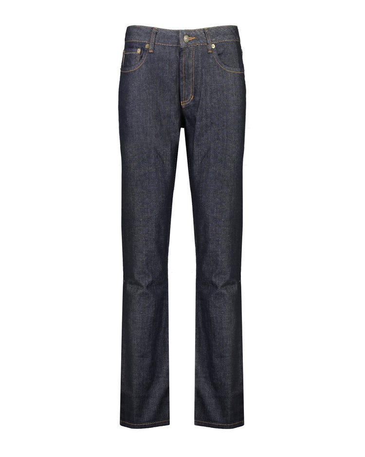 Slim straight leg jeans with mid rise. Five pocket detail. Patch pockets with signature stitching at rear. Antique gold rivets. Gold stitching. Zip fly.