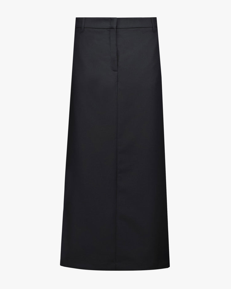 A tailored straight fit trouser skirt cut from wool suiting. Mid rise, featuring a tailored waistband with belt loops, zip fly with button closure, front slit pockets, and slit at back.