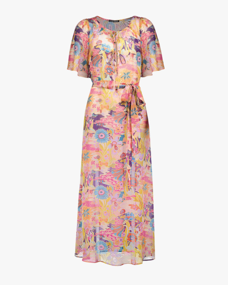 Relaxed fit dress, cut from a floral printed silk chiffon. Featuring a round neckline with delicate gathers, elbow length flare sleeves and removable tie at waist. Pair with a strappy heel and minimal jewels.