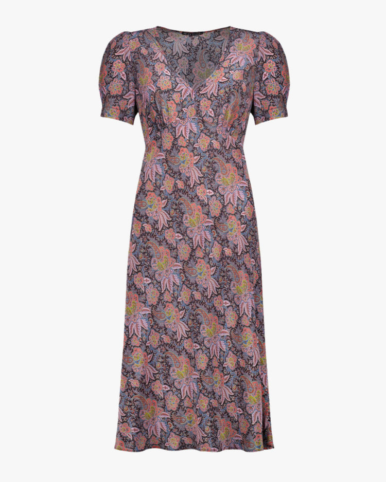 Classic fit dress, cut from a printed silk crepe de chine. Featuring a V-neckline, short puff sleeve and gathers at bust.
