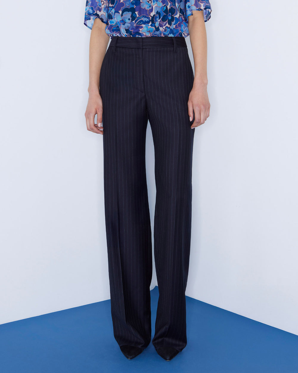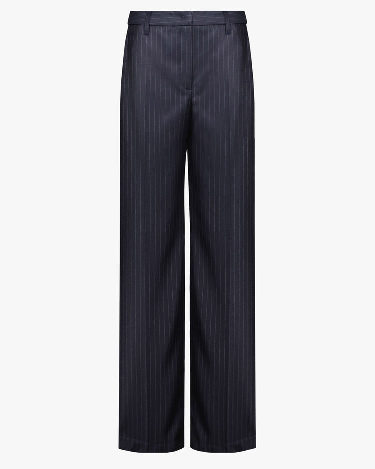 High waisted trouser, cut from a navy wool pinstripe suiting. Featuring a wide-straight leg silhouette, tailored waistband and pressed creases. Pair with the matching Helen Cherry Rae Pinstripe Blazer.